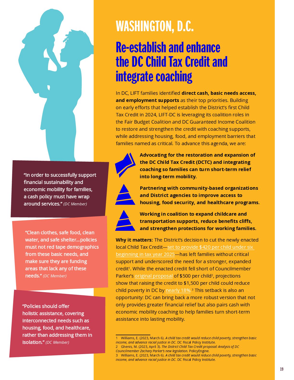 and integrate coaching In DC, LIFT families identified direct cash, basic needs access, and employment supports as their top priorities. Building on early efforts that helped establish the District’s first Child Tax Credit in 2024, LIFT-DC is leveraging its coalition roles in the Fair Budget Coalition and DC Guaranteed Income Coalition to restore and strengthen the credit with coaching supports, while addressing housing, food, and employment barriers that families named as critical. To advance this agenda, we are: Advocating for the restoration and expansion of the DC Child Tax Credit (DCTC) and integrating coaching so families can turn short-term relief into long-term mobility. Partnering with community-based organizations and District agencies to improve access to housing, food security, and healthcare programs. Working in coalition to expand childcare and transportation supports, reduce benefits cliffs, and strengthen protections for working families. Why it matters: The District’s decision to cut the newly enacted local Child Tax Credit—set to provide $420 per child under six beginning in tax year 2025—has left families without critical support and underscored the need for a stronger, expanded credit1. While the enacted credit fell short of Councilmember Parker’s original proposal of $500 per child2, projections show that raising the credit to $1,500 per child could reduce child poverty in DC by nearly 18%.3 This setback is also an opportunity: DC can bring back a more robust version that not only provides greater financial relief but also pairs cash with economic mobility coaching to help families turn short-term assistance into lasting mobility. 1 Williams, E. (2023, March 6). A child tax credit would reduce child poverty, strengthen basic income, and advance racial justice in DC. DC Fiscal Policy Institute. 2 Ghenis, M. (2023, April 3). The District Child Tax Credit proposal: Analysis of DC Councilmember Zachary Parker’s new legislation. PolicyEngine. 3 Williams, E. (2023, March 6). A child tax credit would reduce child poverty, strengthen basic income, and advance racial justice in DC. DC Fiscal Policy Institute. “In order to successfully support “In order to successfully support financial sustainability and financial sustainability and economic mobility for families, economic mobility for families, a cash policy must have wrap a cash policy must have wrap around services.” around services.” (DC Member) “Clean clothes, safe food, clean “Clean clothes, safe food, clean water, and safe shelter…policies water, and safe shelter…policies must not red tape demographics must not red tape demographics from these basic needs, and from these basic needs, and make sure they are funding make sure they are funding areas that lack any of these areas that lack any of these needs.” needs.” (DC Member) “Policies should offer “Policies should offer holistic assistance, covering holistic assistance, covering interconnected needs such as interconnected needs such as housing, food, and healthcare, housing, food, and healthcare, rather than addressing them in rather than addressing them in isolation.” isolation.” (DC Member) 19