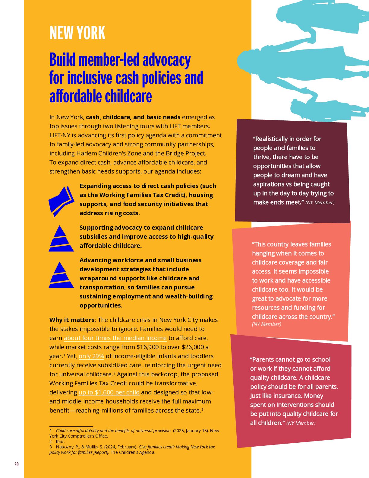 affordable childcare In New York, cash, childcare, and basic needs emerged as top issues through two listening tours with LIFT members. LIFT-NY is advancing its first policy agenda with a commitment to family-led advocacy and strong community partnerships, including Harlem Children’s Zone and the Bridge Project. To expand direct cash, advance affordable childcare, and strengthen basic needs supports, our agenda includes: Expanding access to direct cash policies (such as the Working Families Tax Credit), housing supports, and food security initiatives that address rising costs. Supporting advocacy to expand childcare subsidies and improve access to high-quality affordable childcare. Advancing workforce and small business development strategies that include wraparound supports like childcare and transportation, so families can pursue sustaining employment and wealth-building opportunities. Why it matters: The childcare crisis in New York City makes the stakes impossible to ignore. Families would need to earn about four times the median income to afford care, while market costs range from $16,900 to over $26,000 a year.1 Yet, only 29% of income-eligible infants and toddlers currently receive subsidized care, reinforcing the urgent need for universal childcare.2 Against this backdrop, the proposed Working Families Tax Credit could be transformative, delivering up to $1,600 per child and designed so that low- and middle-income households receive the full maximum benefit—reaching millions of families across the state.3 1 Child care affordability and the benefits of universal provision. (2025, January 15). New York City Comptroller’s Office. 2 Ibid. 3 Nabozny, P., & Mullin, S. (2024, February). Give families credit: Making New York tax policy work for families [Report]. The Children’s Agenda. “This country leaves families “This country leaves families hanging when it comes to hanging when it comes to childcare coverage and fair childcare coverage and fair access. It seems impossible access. It seems impossible to work and have accessible to work and have accessible childcare too. It would be childcare too. It would be great to advocate for more great to advocate for more resources and funding for resources and funding for childcare across the country.” childcare across the country.” (NY Member) “Parents cannot go to school “Parents cannot go to school or work if they cannot afford or work if they cannot afford quality childcare. A childcare quality childcare. A childcare policy should be for all parents. policy should be for all parents. Just like insurance. Money Just like insurance. Money spent on interventions should spent on interventions should be put into quality childcare for be put into quality childcare for all children.” all children.” (NY Member) “Realistically in order for “Realistically in order for people and families to people and families to thrive, there have to be thrive, there have to be opportunities that allow opportunities that allow people to dream and have people to dream and have aspirations vs being caught aspirations vs being caught up in the day to day trying to up in the day to day trying to make ends meet.” make ends meet.” (NY Member) 20
