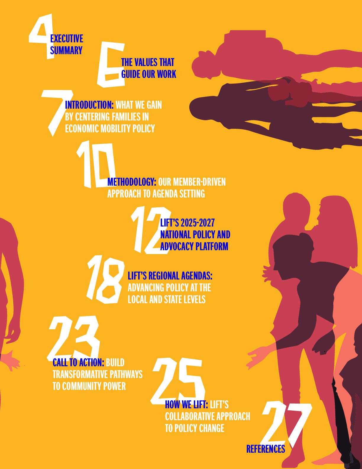 WE GAIN BY CENTERING FAMILIES IN ECONOMIC MOBILITY POLICY METHODOLOGY: OUR MEMBER-DRIVEN APPROACH TO AGENDA SETTING LIFT’S 2025-2027 NATIONAL POLICY AND ADVOCACY PLATFORM LIFT’S REGIONAL AGENDAS: ADVANCING POLICY AT THE LOCAL AND STATE LEVELS CALL TO ACTION: BUILD TRANSFORMATIVE PATHWAYS TO COMMUNITY POWER HOW WE LIFT: LIFT’S COLLABORATIVE APPROACH TO POLICY CHANGE REFERENCES