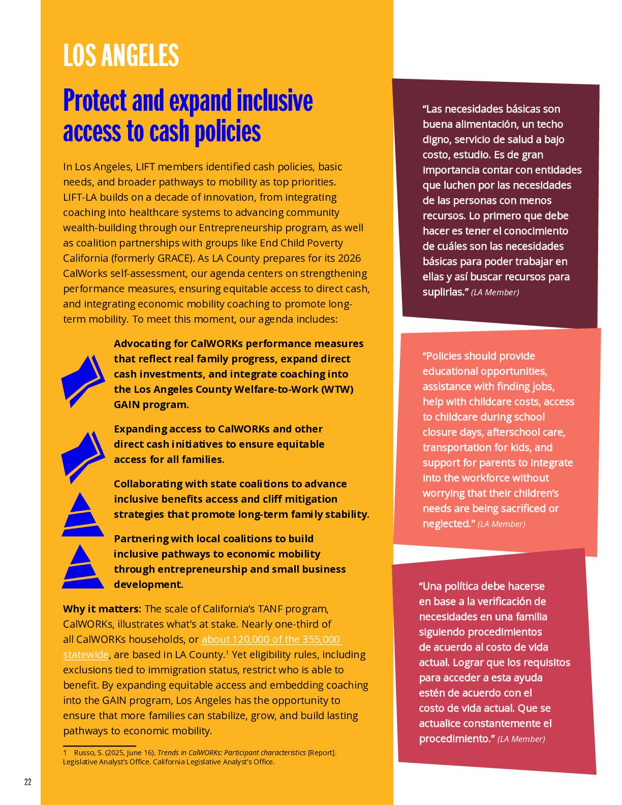 un techo buena alimentación, un techo digno, servicio de salud a bajo digno, servicio de salud a bajo costo, estudio. Es de gran costo, estudio. Es de gran importancia contar con entidades importancia contar con entidades que luchen por las necesidades que luchen por las necesidades de las personas con menos de las personas con menos recursos. Lo primero que debe recursos. Lo primero que debe hacer es tener el conocimiento hacer es tener el conocimiento de cuáles son las necesidades de cuáles son las necesidades básicas para poder trabajar en básicas para poder trabajar en ellas y así buscar recursos para ellas y así buscar recursos para suplirlas.” suplirlas.” (LA Member) “Policies should provide “Policies should provide educational opportunities, educational opportunities, assistance with finding jobs, assistance with finding jobs, help with childcare costs, access help with childcare costs, access to childcare during school to childcare during school closure days, afterschool care, closure days, afterschool care, transportation for kids, and transportation for kids, and support for parents to integrate support for parents to integrate into the workforce without into the workforce without worrying that their children’s worrying that their children’s needs are being sacrificed or needs are being sacrificed or neglected.” neglected.” (LA Member) “Una política debe hacerse “Una política debe hacerse en base a la verificación de en base a la verificación de necesidades en una familia necesidades en una familia siguiendo procedimientos siguiendo procedimientos de acuerdo al costo de vida de acuerdo al costo de vida actual. Lograr que los requisitos actual. Lograr que los requisitos para acceder a esta ayuda para acceder a esta ayuda estén de acuerdo con el estén de acuerdo con el costo de vida actual. Que se costo de vida actual. Que se actualice constantemente el actualice constantemente el procedimiento.” procedimiento.” (LA Member) LOS ANGELES Protect and expand inclusive access to cash policies In Los Angeles, LIFT members identified cash policies, basic needs, and broader pathways to mobility as top priorities. LIFT-LA builds on a decade of innovation, from integrating coaching into healthcare systems to advancing community wealth-building through our Entrepreneurship program, as well as coalition partnerships with groups like End Child Poverty California (formerly GRACE). As LA County prepares for its 2026 CalWorks self-assessment, our agenda centers on strengthening performance measures, ensuring equitable access to direct cash, and integrating economic mobility coaching to promote long- term mobility. To meet this moment, our agenda includes: Advocating for CalWORKs performance measures that reflect real family progress, expand direct cash investments, and integrate coaching into the Los Angeles County Welfare-to-Work (WTW) GAIN program. Expanding access to CalWORKs and other direct cash initiatives to ensure equitable access for all families. Collaborating with state coalitions to advance inclusive benefits access and cliff mitigation strategies that promote long-term family stability. Partnering with local coalitions to build inclusive pathways to economic mobility through entrepreneurship and small business development. Why it matters: The scale of California’s TANF program, CalWORKs, illustrates what’s at stake. Nearly one-third of all CalWORKs households, or about 120,000 of the 355,000 statewide, are based in LA County.1 Yet eligibility rules, including exclusions tied to immigration status, restrict who is able to benefit. By expanding equitable access and embedding coaching into the GAIN program, Los Angeles has the opportunity to ensure that more families can stabilize, grow, and build lasting pathways to economic mobility. 1 Russo, S. (2025, June 16). Trends in CalWORKs: Participant characteristics [Report]. Legislative Analyst’s Office. California Legislative Analyst’s Office. 22