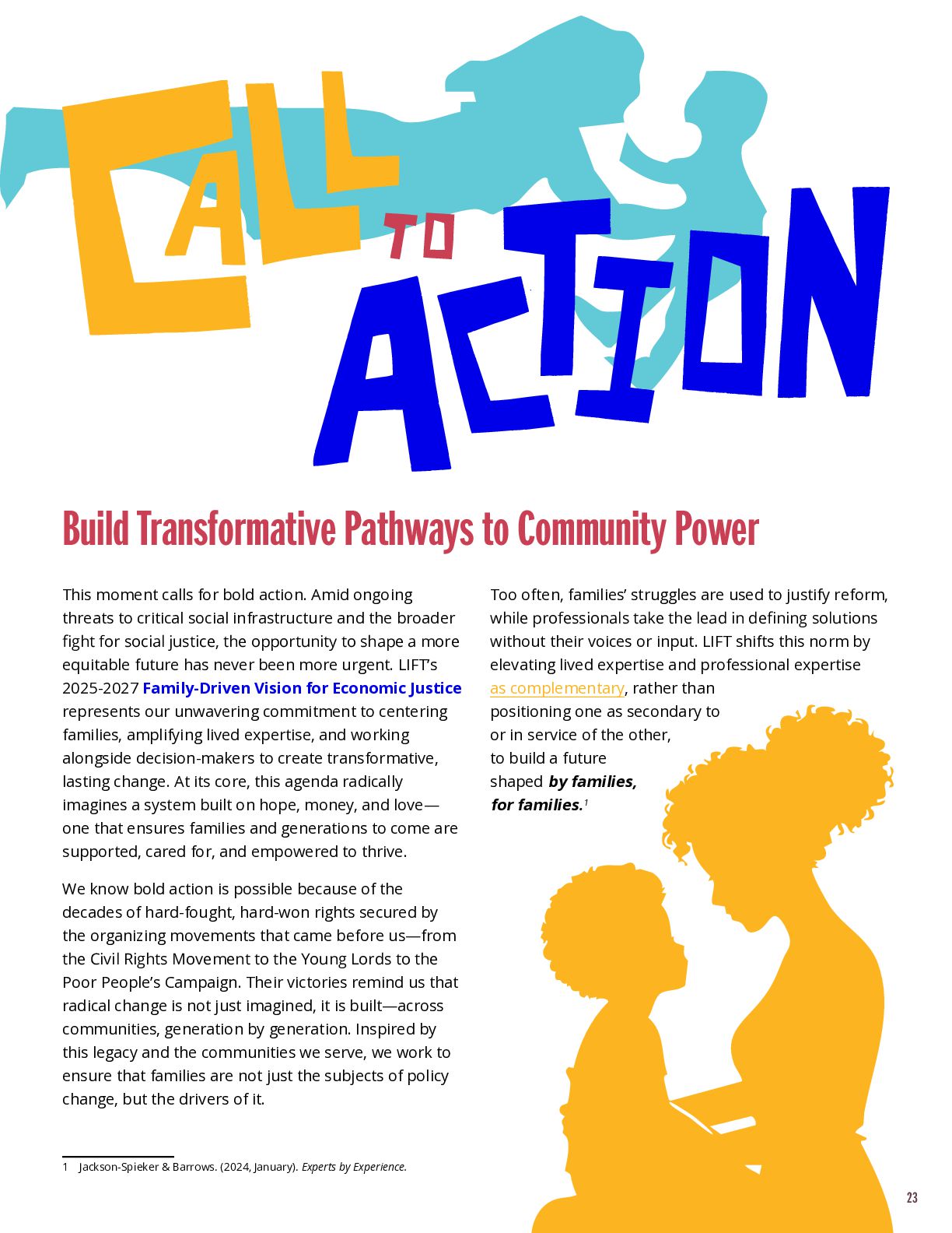 bold action. Amid ongoing threats to critical social infrastructure and the broader fight for social justice, the opportunity to shape a more equitable future has never been more urgent. LIFT’s 2025-2027 Family-Driven Vision for Economic Justice represents our unwavering commitment to centering families, amplifying lived expertise, and working alongside decision-makers to create transformative, lasting change. At its core, this agenda radically imagines a system built on hope, money, and love— one that ensures families and generations to come are supported, cared for, and empowered to thrive. We know bold action is possible because of the decades of hard-fought, hard-won rights secured by the organizing movements that came before us—from the Civil Rights Movement to the Young Lords to the Poor People’s Campaign. Their victories remind us that radical change is not just imagined, it is built—across communities, generation by generation. Inspired by this legacy and the communities we serve, we work to ensure that families are not just the subjects of policy change, but the drivers of it. 1 Jackson-Spieker & Barrows. (2024, January). Experts by Experience. Too often, families’ struggles are used to justify reform, while professionals take the lead in defining solutions without their voices or input. LIFT shifts this norm by elevating lived expertise and professional expertise as complementary, rather than positioning one as secondary to or in service of the other, to build a future shaped by families, for families.1 23