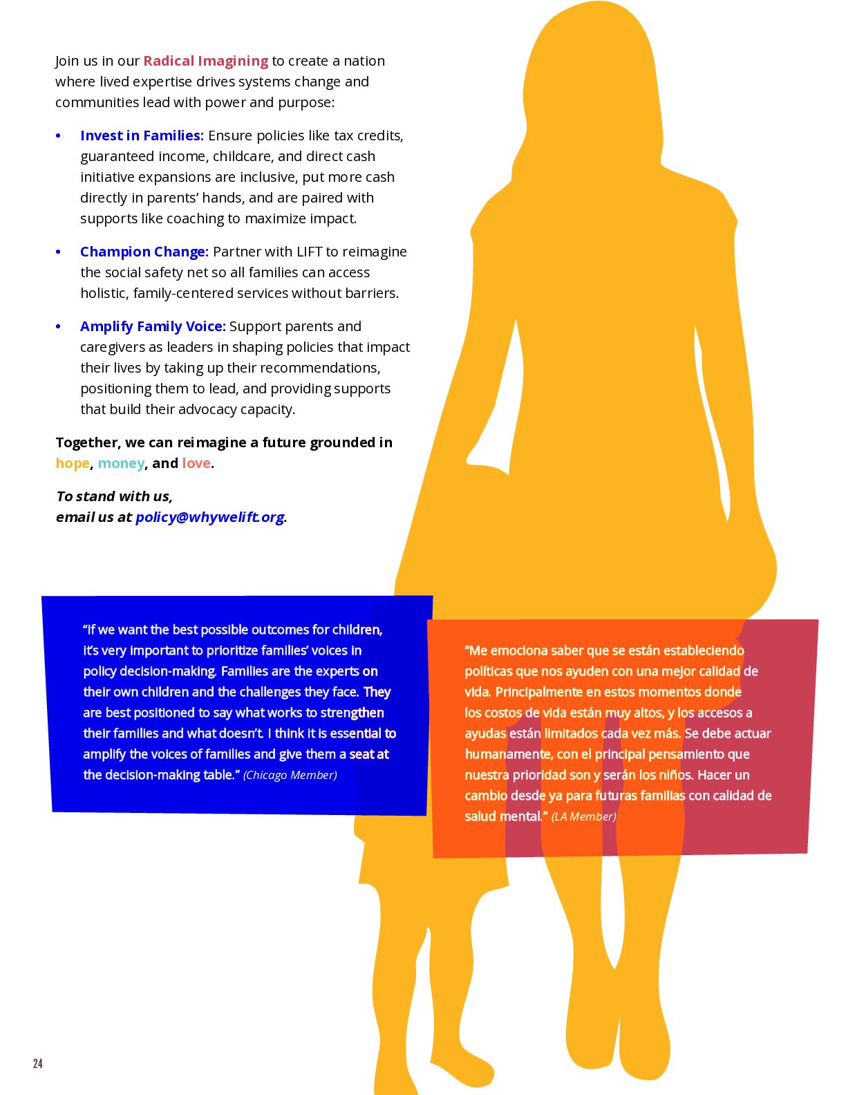 where lived expertise drives systems change and communities lead with power and purpose: • Invest in Families: Ensure policies like tax credits, guaranteed income, childcare, and direct cash initiative expansions are inclusive, put more cash directly in parents’ hands, and are paired with supports like coaching to maximize impact. • Champion Change: Partner with LIFT to reimagine the social safety net so all families can access holistic, family-centered services without barriers. • Amplify Family Voice: Support parents and caregivers as leaders in shaping policies that impact their lives by taking up their recommendations, positioning them to lead, and providing supports that build their advocacy capacity. Together, we can reimagine a future grounded in hope, money, and love. To stand with us, email us at [email protected]. “If we want the best possible outcomes for children, “If we want the best possible outcomes for children, it’s very important to prioritize families’ voices in it’s very important to prioritize families’ voices in policy decision-making. Families are the experts on policy decision-making. Families are the experts on their own children and the challenges they face. They their own children and the challenges they face. They are best positioned to say what works to strengthen are best positioned to say what works to strengthen their families and what doesn’t. I think it is essential to their families and what doesn’t. I think it is essential to amplify the voices of families and give them a seat at amplify the voices of families and give them a seat at the decision-making table.” the decision-making table.” (Chicago Member) “Me emociona saber que se están estableciendo “Me emociona saber que se están estableciendo políticas que nos ayuden con una mejor calidad de políticas que nos ayuden con una mejor calidad de vida. Principalmente en estos momentos donde vida. Principalmente en estos momentos donde los costos de vida están muy altos, y los accesos a los costos de vida están muy altos, y los accesos a ayudas están limitados cada vez más. Se debe actuar ayudas están limitados cada vez más. Se debe actuar humanamente, con el principal pensamiento que humanamente, con el principal pensamiento que nuestra prioridad son y serán los niños. Hacer un nuestra prioridad son y serán los niños. Hacer un cambio desde ya para futuras familias con calidad de cambio desde ya para futuras familias con calidad de salud mental.” salud mental.” (LA Member) 24