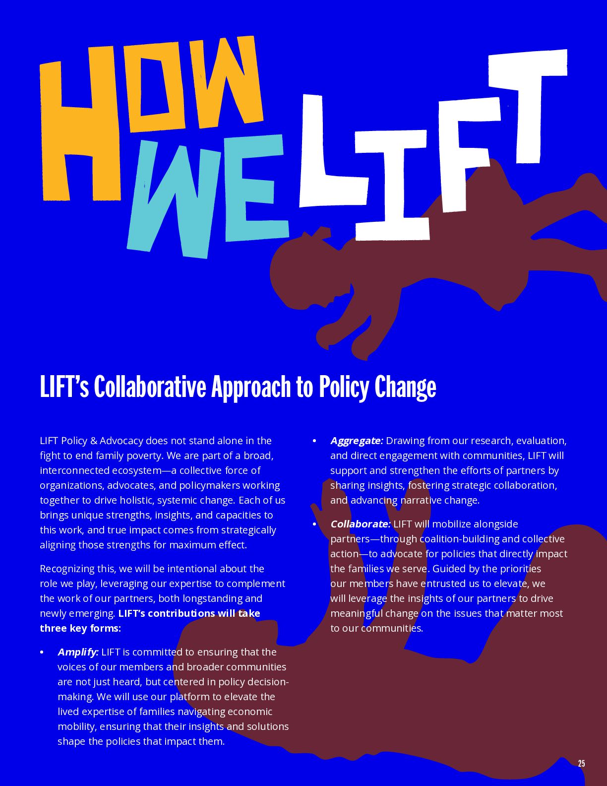 does not stand alone in the fight to end family poverty. We are part of a broad, interconnected ecosystem—a collective force of organizations, advocates, and policymakers working together to drive holistic, systemic change. Each of us brings unique strengths, insights, and capacities to this work, and true impact comes from strategically aligning those strengths for maximum effect. Recognizing this, we will be intentional about the role we play, leveraging our expertise to complement the work of our partners, both longstanding and newly emerging. LIFT’s contributions will take three key forms: • Amplify: LIFT is committed to ensuring that the voices of our members and broader communities are not just heard, but centered in policy decision- making. We will use our platform to elevate the lived expertise of families navigating economic mobility, ensuring that their insights and solutions shape the policies that impact them. • Aggregate: Drawing from our research, evaluation, and direct engagement with communities, LIFT will support and strengthen the efforts of partners by sharing insights, fostering strategic collaboration, and advancing narrative change. • Collaborate: LIFT will mobilize alongside partners—through coalition-building and collective action—to advocate for policies that directly impact the families we serve. Guided by the priorities our members have entrusted us to elevate, we will leverage the insights of our partners to drive meaningful change on the issues that matter most to our communities. 25