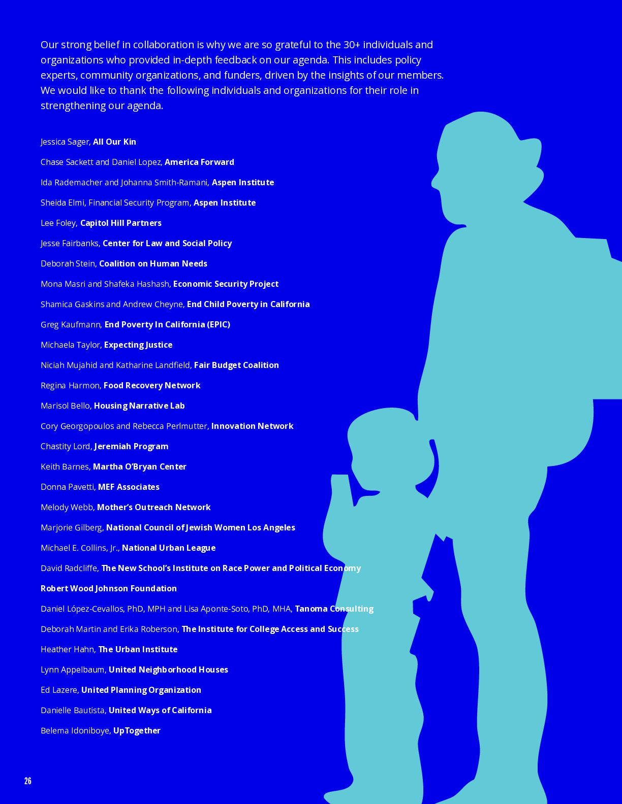 grateful to the 30+ individuals and organizations who provided in-depth feedback on our agenda. This includes policy experts, community organizations, and funders, driven by the insights of our members. We would like to thank the following individuals and organizations for their role in strengthening our agenda. Jessica Sager, All Our Kin Chase Sackett and Daniel Lopez, America Forward Ida Rademacher and Johanna Smith-Ramani, Aspen Institute Sheida Elmi, Financial Security Program, Aspen Institute Lee Foley, Capitol Hill Partners Jesse Fairbanks, Center for Law and Social Policy Deborah Stein, Coalition on Human Needs Mona Masri and Shafeka Hashash, Economic Security Project Shamica Gaskins and Andrew Cheyne, End Child Poverty in California Greg Kaufmann, End Poverty In California (EPIC) Michaela Taylor, Expecting Justice Niciah Mujahid and Katharine Landfield, Fair Budget Coalition Regina Harmon, Food Recovery Network Marisol Bello, Housing Narrative Lab Cory Georgopoulos and Rebecca Perlmutter, Innovation Network Chastity Lord, Jeremiah Program Keith Barnes, Martha O’Bryan Center Donna Pavetti, MEF Associates Melody Webb, Mother’s Outreach Network Marjorie Gilberg, National Council of Jewish Women Los Angeles Michael E. Collins, Jr., National Urban League David Radcliffe, The New School’s Institute on Race Power and Political Economy Robert Wood Johnson Foundation Daniel López-Cevallos, PhD, MPH and Lisa Aponte-Soto, PhD, MHA, Tanoma Consulting Deborah Martin and Erika Roberson, The Institute for College Access and Success Heather Hahn, The Urban Institute Lynn Appelbaum, United Neighborhood Houses Ed Lazere, United Planning Organization Danielle Bautista, United Ways of California Belema Idoniboye, UpTogether 26