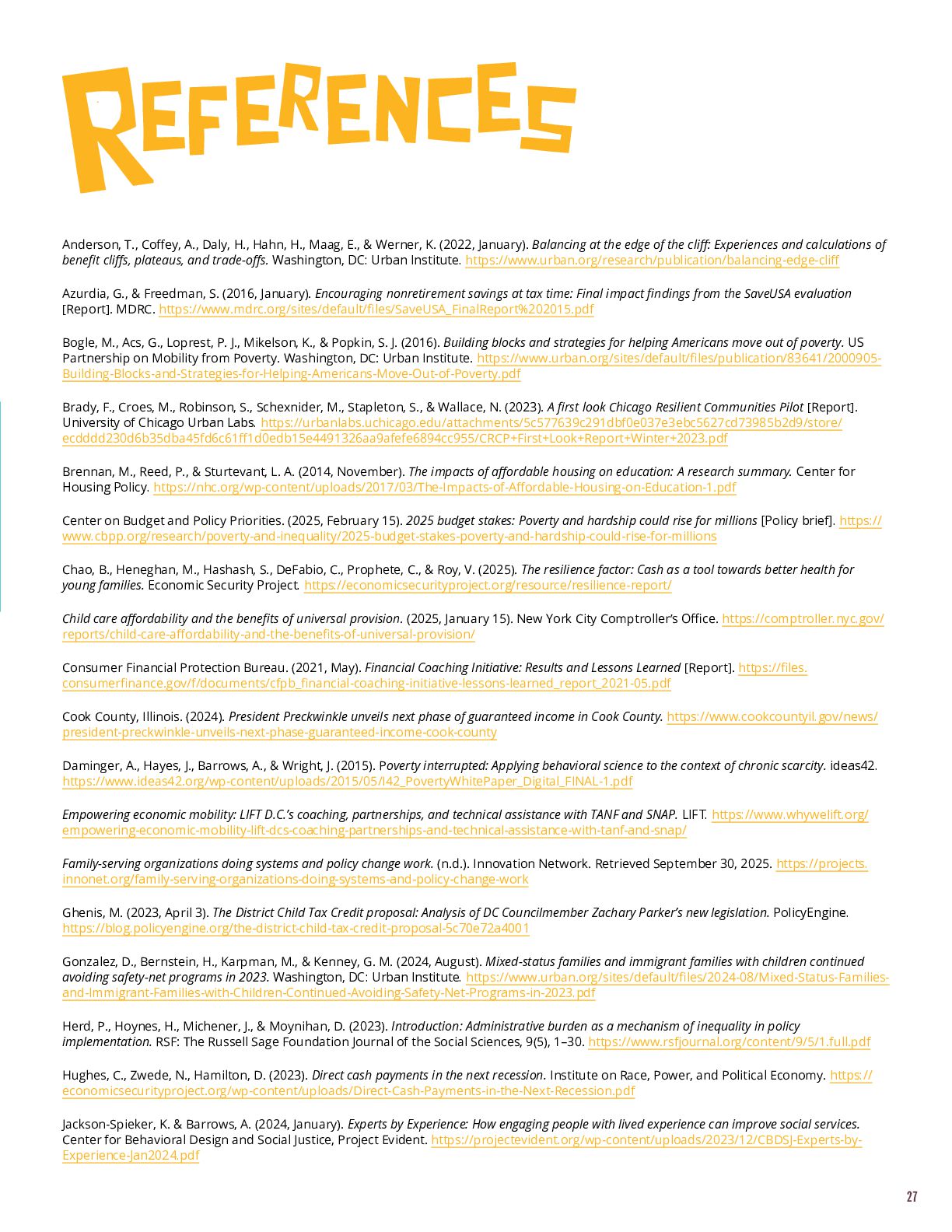 & Werner, K. (2022, January). Balancing at the edge of the cliff: Experiences and calculations of benefit cliffs, plateaus, and trade-offs. Washington, DC: Urban Institute. https://www.urban.org/research/publication/balancing-edge-cliff Azurdia, G., & Freedman, S. (2016, January). Encouraging nonretirement savings at tax time: Final impact findings from the SaveUSA evaluation [Report]. MDRC. https://www.mdrc.org/sites/default/files/SaveUSA_FinalReport%202015.pdf Bogle, M., Acs, G., Loprest, P. J., Mikelson, K., & Popkin, S. J. (2016). Building blocks and strategies for helping Americans move out of poverty. US Partnership on Mobility from Poverty. Washington, DC: Urban Institute. https://www.urban.org/sites/default/files/publication/83641/2000905- Building-Blocks-and-Strategies-for-Helping-Americans-Move-Out-of-Poverty.pdf Brady, F., Croes, M., Robinson, S., Schexnider, M., Stapleton, S., & Wallace, N. (2023). A first look Chicago Resilient Communities Pilot [Report]. University of Chicago Urban Labs. https://urbanlabs.uchicago.edu/attachments/5c577639c291dbf0e037e3ebc5627cd73985b2d9/store/ ecdddd230d6b35dba45fd6c61ff1d0edb15e4491326aa9afefe6894cc955/CRCP+First+Look+Report+Winter+2023.pdf Brennan, M., Reed, P., & Sturtevant, L. A. (2014, November). The impacts of affordable housing on education: A research summary. Center for Housing Policy. https://nhc.org/wp-content/uploads/2017/03/The-Impacts-of-Affordable-Housing-on-Education-1.pdf Center on Budget and Policy Priorities. (2025, February 15). 2025 budget stakes: Poverty and hardship could rise for millions [Policy brief]. https:// www.cbpp.org/research/poverty-and-inequality/2025-budget-stakes-poverty-and-hardship-could-rise-for-millions Chao, B., Heneghan, M., Hashash, S., DeFabio, C., Prophete, C., & Roy, V. (2025). The resilience factor: Cash as a tool towards better health for young families. Economic Security Project. https://economicsecurityproject.org/resource/resilience-report/ Child care affordability and the benefits of universal provision. (2025, January 15). New York City Comptroller’s Office. https://comptroller.nyc.gov/ reports/child-care-affordability-and-the-benefits-of-universal-provision/ Consumer Financial Protection Bureau. (2021, May). Financial Coaching Initiative: Results and Lessons Learned [Report]. https://files. consumerfinance.gov/f/documents/cfpb_financial-coaching-initiative-lessons-learned_report_2021-05.pdf Cook County, Illinois. (2024). President Preckwinkle unveils next phase of guaranteed income in Cook County. https://www.cookcountyil.gov/news/ president-preckwinkle-unveils-next-phase-guaranteed-income-cook-county Daminger, A., Hayes, J., Barrows, A., & Wright, J. (2015). Poverty interrupted: Applying behavioral science to the context of chronic scarcity. ideas42. https://www.ideas42.org/wp-content/uploads/2015/05/I42_PovertyWhitePaper_Digital_FINAL-1.pdf Empowering economic mobility: LIFT D.C.’s coaching, partnerships, and technical assistance with TANF and SNAP. LIFT. https://www.whywelift.org/ empowering-economic-mobility-lift-dcs-coaching-partnerships-and-technical-assistance-with-tanf-and-snap/ Family-serving organizations doing systems and policy change work. (n.d.). Innovation Network. Retrieved September 30, 2025. https://projects. innonet.org/family-serving-organizations-doing-systems-and-policy-change-work Ghenis, M. (2023, April 3). The District Child Tax Credit proposal: Analysis of DC Councilmember Zachary Parker’s new legislation. PolicyEngine. https://blog.policyengine.org/the-district-child-tax-credit-proposal-5c70e72a4001 Gonzalez, D., Bernstein, H., Karpman, M., & Kenney, G. M. (2024, August). Mixed-status families and immigrant families with children continued avoiding safety-net programs in 2023. Washington, DC: Urban Institute. https://www.urban.org/sites/default/files/2024-08/Mixed-Status-Families- and-Immigrant-Families-with-Children-Continued-Avoiding-Safety-Net-Programs-in-2023.pdf Herd, P., Hoynes, H., Michener, J., & Moynihan, D. (2023). Introduction: Administrative burden as a mechanism of inequality in policy implementation. RSF: The Russell Sage Foundation Journal of the Social Sciences, 9(5), 1–30. https://www.rsfjournal.org/content/9/5/1.full.pdf Hughes, C., Zwede, N., Hamilton, D. (2023). Direct cash payments in the next recession. Institute on Race, Power, and Political Economy. https:// economicsecurityproject.org/wp-content/uploads/Direct-Cash-Payments-in-the-Next-Recession.pdf Jackson-Spieker, K. & Barrows, A. (2024, January). Experts by Experience: How engaging people with lived experience can improve social services. Center for Behavioral Design and Social Justice, Project Evident. https://projectevident.org/wp-content/uploads/2023/12/CBDSJ-Experts-by- Experience-Jan2024.pdf 27
