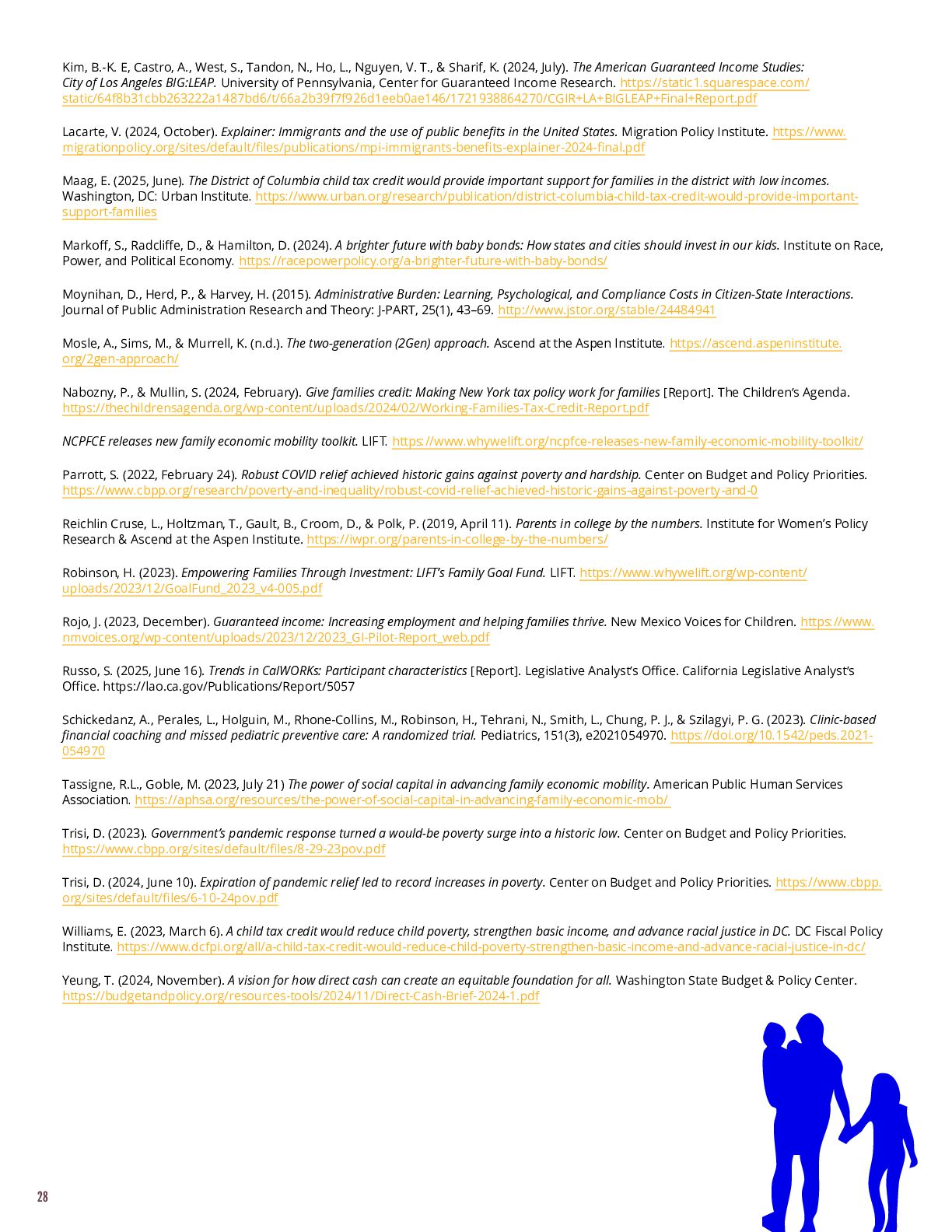 L., Nguyen, V. T., & Sharif, K. (2024, July). The American Guaranteed Income Studies: City of Los Angeles BIG:LEAP. University of Pennsylvania, Center for Guaranteed Income Research. https://static1.squarespace.com/ static/64f8b31cbb263222a1487bd6/t/66a2b39f7f926d1eeb0ae146/1721938864270/CGIR+LA+BIGLEAP+Final+Report.pdf Lacarte, V. (2024, October). Explainer: Immigrants and the use of public benefits in the United States. Migration Policy Institute. https://www. migrationpolicy.org/sites/default/files/publications/mpi-immigrants-benefits-explainer-2024-final.pdf Maag, E. (2025, June). The District of Columbia child tax credit would provide important support for families in the district with low incomes. Washington, DC: Urban Institute. https://www.urban.org/research/publication/district-columbia-child-tax-credit-would-provide-important- support-families Markoff, S., Radcliffe, D., & Hamilton, D. (2024). A brighter future with baby bonds: How states and cities should invest in our kids. Institute on Race, Power, and Political Economy. https://racepowerpolicy.org/a-brighter-future-with-baby-bonds/ Moynihan, D., Herd, P., & Harvey, H. (2015). Administrative Burden: Learning, Psychological, and Compliance Costs in Citizen-State Interactions. Journal of Public Administration Research and Theory: J-PART, 25(1), 43–69. http://www.jstor.org/stable/24484941 Mosle, A., Sims, M., & Murrell, K. (n.d.). The two-generation (2Gen) approach. Ascend at the Aspen Institute. https://ascend.aspeninstitute. org/2gen-approach/ Nabozny, P., & Mullin, S. (2024, February). Give families credit: Making New York tax policy work for families [Report]. The Children’s Agenda. https://thechildrensagenda.org/wp-content/uploads/2024/02/Working-Families-Tax-Credit-Report.pdf NCPFCE releases new family economic mobility toolkit. LIFT. https://www.whywelift.org/ncpfce-releases-new-family-economic-mobility-toolkit/ Parrott, S. (2022, February 24). Robust COVID relief achieved historic gains against poverty and hardship. Center on Budget and Policy Priorities. https://www.cbpp.org/research/poverty-and-inequality/robust-covid-relief-achieved-historic-gains-against-poverty-and-0 Reichlin Cruse, L., Holtzman, T., Gault, B., Croom, D., & Polk, P. (2019, April 11). Parents in college by the numbers. Institute for Women’s Policy Research & Ascend at the Aspen Institute. https://iwpr.org/parents-in-college-by-the-numbers/ Robinson, H. (2023). Empowering Families Through Investment: LIFT’s Family Goal Fund. LIFT. https://www.whywelift.org/wp-content/ uploads/2023/12/GoalFund_2023_v4-005.pdf Rojo, J. (2023, December). Guaranteed income: Increasing employment and helping families thrive. New Mexico Voices for Children. https://www. nmvoices.org/wp-content/uploads/2023/12/2023_GI-Pilot-Report_web.pdf Russo, S. (2025, June 16). Trends in CalWORKs: Participant characteristics [Report]. Legislative Analyst’s Office. California Legislative Analyst’s Office. https://lao.ca.gov/Publications/Report/5057 Schickedanz, A., Perales, L., Holguin, M., Rhone-Collins, M., Robinson, H., Tehrani, N., Smith, L., Chung, P. J., & Szilagyi, P. G. (2023). Clinic-based financial coaching and missed pediatric preventive care: A randomized trial. Pediatrics, 151(3), e2021054970. https://doi.org/10.1542/peds.2021- 054970 Tassigne, R.L., Goble, M. (2023, July 21) The power of social capital in advancing family economic mobility. American Public Human Services Association. https://aphsa.org/resources/the-power-of-social-capital-in-advancing-family-economic-mob/ Trisi, D. (2023). Government’s pandemic response turned a would‑be poverty surge into a historic low. Center on Budget and Policy Priorities. https://www.cbpp.org/sites/default/files/8-29-23pov.pdf Trisi, D. (2024, June 10). Expiration of pandemic relief led to record increases in poverty. Center on Budget and Policy Priorities. https://www.cbpp. org/sites/default/files/6-10-24pov.pdf Williams, E. (2023, March 6). A child tax credit would reduce child poverty, strengthen basic income, and advance racial justice in DC. DC Fiscal Policy Institute. https://www.dcfpi.org/all/a-child-tax-credit-would-reduce-child-poverty-strengthen-basic-income-and-advance-racial-justice-in-dc/ Yeung, T. (2024, November). A vision for how direct cash can create an equitable foundation for all. Washington State Budget & Policy Center. https://budgetandpolicy.org/resources-tools/2024/11/Direct-Cash-Brief-2024-1.pdf 28