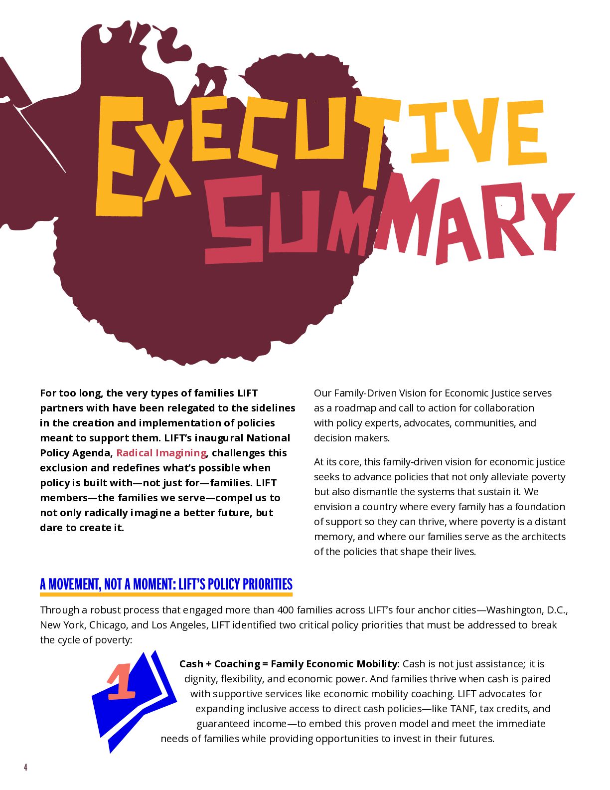 with have been relegated to the sidelines in the creation and implementation of policies meant to support them. LIFT’s inaugural National Policy Agenda, Radical Imagining, challenges this exclusion and redefines what’s possible when policy is built with—not just for—families. LIFT members—the families we serve—compel us to not only radically imagine a better future, but dare to create it. Our Family-Driven Vision for Economic Justice serves as a roadmap and call to action for collaboration with policy experts, advocates, communities, and decision makers. At its core, this family-driven vision for economic justice seeks to advance policies that not only alleviate poverty but also dismantle the systems that sustain it. We envision a country where every family has a foundation of support so they can thrive, where poverty is a distant memory, and where our families serve as the architects of the policies that shape their lives. A MOVEMENT, NOT A MOMENT: LIFT’S POLICY PRIORITIES Through a robust process that engaged more than 400 families across LIFT’s four anchor cities—Washington, D.C., New York, Chicago, and Los Angeles, LIFT identified two critical policy priorities that must be addressed to break the cycle of poverty: Cash + Coaching = Family Economic Mobility: Cash is not just assistance; it is dignity, flexibility, and economic power. And families thrive when cash is paired with supportive services like economic mobility coaching. LIFT advocates for expanding inclusive access to direct cash policies—like TANF, tax credits, and guaranteed income—to embed this proven model and meet the immediate needs of families while providing opportunities to invest in their futures. 4