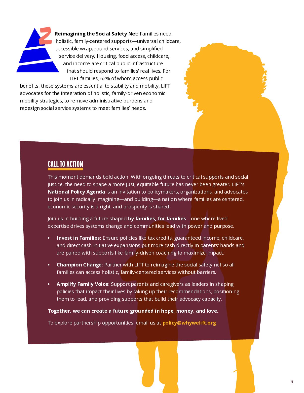 childcare, accessible wraparound services, and simplified service delivery. Housing, food access, childcare, and income are critical public infrastructure that should respond to families’ real lives. For LIFT families, 62% of whom access public benefits, these systems are essential to stability and mobility. LIFT advocates for the integration of holistic, family-driven economic mobility strategies, to remove administrative burdens and redesign social service systems to meet families’ needs. CALL TO ACTION This moment demands bold action. With ongoing threats to critical supports and social justice, the need to shape a more just, equitable future has never been greater. LIFT’s National Policy Agenda is an invitation to policymakers, organizations, and advocates to join us in radically imagining—and building—a nation where families are centered, economic security is a right, and prosperity is shared. Join us in building a future shaped by families, for families—one where lived expertise drives systems change and communities lead with power and purpose. • Invest in Families: Ensure policies like tax credits, guaranteed income, childcare, and direct cash initiative expansions put more cash directly in parents’ hands and are paired with supports like family-driven coaching to maximize impact. • Champion Change: Partner with LIFT to reimagine the social safety net so all families can access holistic, family-centered services without barriers. • Amplify Family Voice: Support parents and caregivers as leaders in shaping policies that impact their lives by taking up their recommendations, positioning them to lead, and providing supports that build their advocacy capacity. Together, we can create a future grounded in hope, money, and love. To explore partnership opportunities, email us at [email protected]. 5