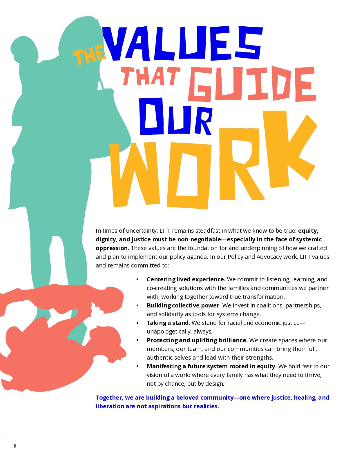 know to be true: equity, dignity, and justice must be non-negotiable—especially in the face of systemic oppression. These values are the foundation for and underpinning of how we crafted and plan to implement our policy agenda. In our Policy and Advocacy work, LIFT values and remains committed to: • Centering lived experience. We commit to listening, learning, and co-creating solutions with the families and communities we partner with, working together toward true transformation. • Building collective power. We invest in coalitions, partnerships, and solidarity as tools for systems change. • Taking a stand. We stand for racial and economic justice— unapologetically, always. • Protecting and uplifting brilliance. We create spaces where our members, our team, and our communities can bring their full, authentic selves and lead with their strengths. • Manifesting a future system rooted in equity. We hold fast to our vision of a world where every family has what they need to thrive, not by chance, but by design. Together, we are building a beloved community—one where justice, healing, and liberation are not aspirations but realities. 6