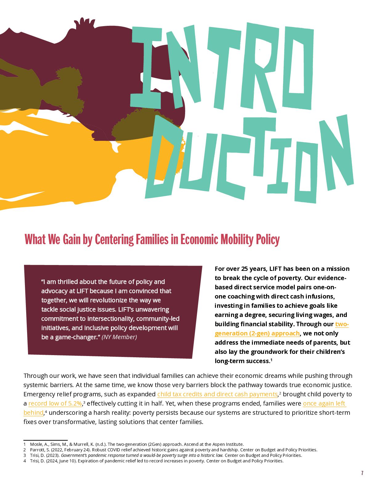 to break the cycle of poverty. Our evidence- based direct service model pairs one-on- one coaching with direct cash infusions, investing in families to achieve goals like earning a degree, securing living wages, and building financial stability. Through our two- generation (2-gen) approach, we not only address the immediate needs of parents, but also lay the groundwork for their children’s long-term success.1 Through our work, we have seen that individual families can achieve their economic dreams while pushing through systemic barriers. At the same time, we know those very barriers block the pathway towards true economic justice. Emergency relief programs, such as expanded child tax credits and direct cash payments,2 brought child poverty to a record low of 5.2%,3 effectively cutting it in half. Yet, when these programs ended, families were once again left behind,4 underscoring a harsh reality: poverty persists because our systems are structured to prioritize short-term fixes over transformative, lasting solutions that center families. 1 Mosle, A., Sims, M., & Murrell, K. (n.d.). The two-generation (2Gen) approach. Ascend at the Aspen Institute. 2 Parrott, S. (2022, February 24). Robust COVID relief achieved historic gains against poverty and hardship. Center on Budget and Policy Priorities. 3 Trisi, D. (2023). Government’s pandemic response turned a would‑be poverty surge into a historic low. Center on Budget and Policy Priorities. 4 Trisi, D. (2024, June 10). Expiration of pandemic relief led to record increases in poverty. Center on Budget and Policy Priorities. What We Gain by Centering Families in Economic Mobility Policy “I am thrilled about the future of policy and “I am thrilled about the future of policy and advocacy at LIFT because I am convinced that advocacy at LIFT because I am convinced that together, we will revolutionize the way we together, we will revolutionize the way we tackle social justice issues. LIFT’s unwavering tackle social justice issues. LIFT’s unwavering commitment to intersectionality, community-led commitment to intersectionality, community-led initiatives, and inclusive policy development will initiatives, and inclusive policy development will be a game-changer.” be a game-changer.” (NY Member) 7