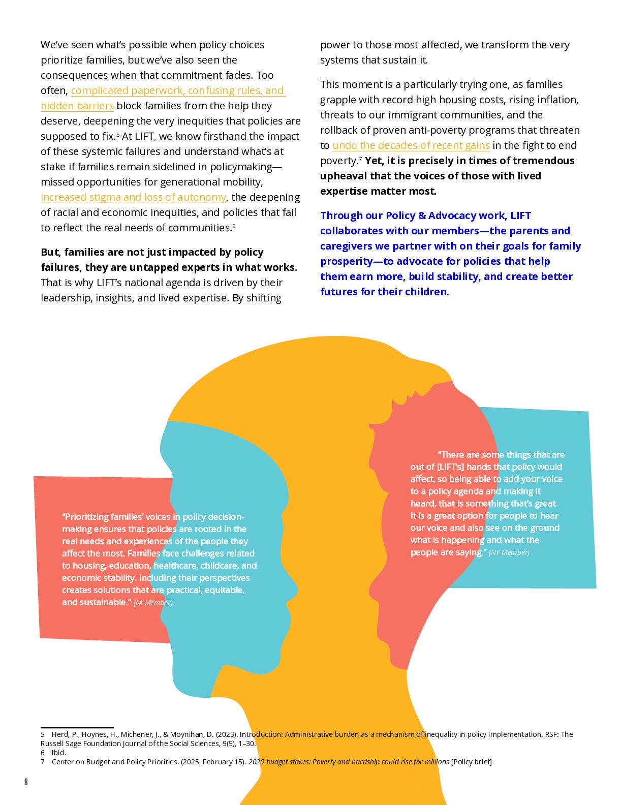 policy decision- making ensures that policies are rooted in the making ensures that policies are rooted in the real needs and experiences of the people they real needs and experiences of the people they affect the most. Families face challenges related affect the most. Families face challenges related to housing, education, healthcare, childcare, and to housing, education, healthcare, childcare, and economic stability. Including their perspectives economic stability. Including their perspectives creates solutions that are practical, equitable, creates solutions that are practical, equitable, and sustainable.” and sustainable.” (LA Member) “There are some things that are “There are some things that are out of [LIFT’s] hands that policy would out of [LIFT’s] hands that policy would affect, so being able to add your voice affect, so being able to add your voice to a policy agenda and making it to a policy agenda and making it heard, that is something that’s great. heard, that is something that’s great. It is a great option for people to hear It is a great option for people to hear our voice and also see on the ground our voice and also see on the ground what is happening and what the what is happening and what the people are saying.” people are saying.” (NY Member) We’ve seen what’s possible when policy choices prioritize families, but we’ve also seen the consequences when that commitment fades. Too often, complicated paperwork, confusing rules, and hidden barriers block families from the help they deserve, deepening the very inequities that policies are supposed to fix.5 At LIFT, we know firsthand the impact of these systemic failures and understand what’s at stake if families remain sidelined in policymaking— missed opportunities for generational mobility, increased stigma and loss of autonomy, the deepening of racial and economic inequities, and policies that fail to reflect the real needs of communities.6 But, families are not just impacted by policy failures, they are untapped experts in what works. That is why LIFT’s national agenda is driven by their leadership, insights, and lived expertise. By shifting 5 Herd, P., Hoynes, H., Michener, J., & Moynihan, D. (2023). Introduction: Administrative burden as a mechanism of inequality in policy implementation. RSF: The Russell Sage Foundation Journal of the Social Sciences, 9(5), 1–30. 6 Ibid. 7 Center on Budget and Policy Priorities. (2025, February 15). 2025 budget stakes: Poverty and hardship could rise for millions [Policy brief]. power to those most affected, we transform the very systems that sustain it. This moment is a particularly trying one, as families grapple with record high housing costs, rising inflation, threats to our immigrant communities, and the rollback of proven anti-poverty programs that threaten to undo the decades of recent gains in the fight to end poverty.7 Yet, it is precisely in times of tremendous upheaval that the voices of those with lived expertise matter most. Through our Policy & Advocacy work, LIFT collaborates with our members—the parents and caregivers we partner with on their goals for family prosperity—to advocate for policies that help them earn more, build stability, and create better futures for their children. 8