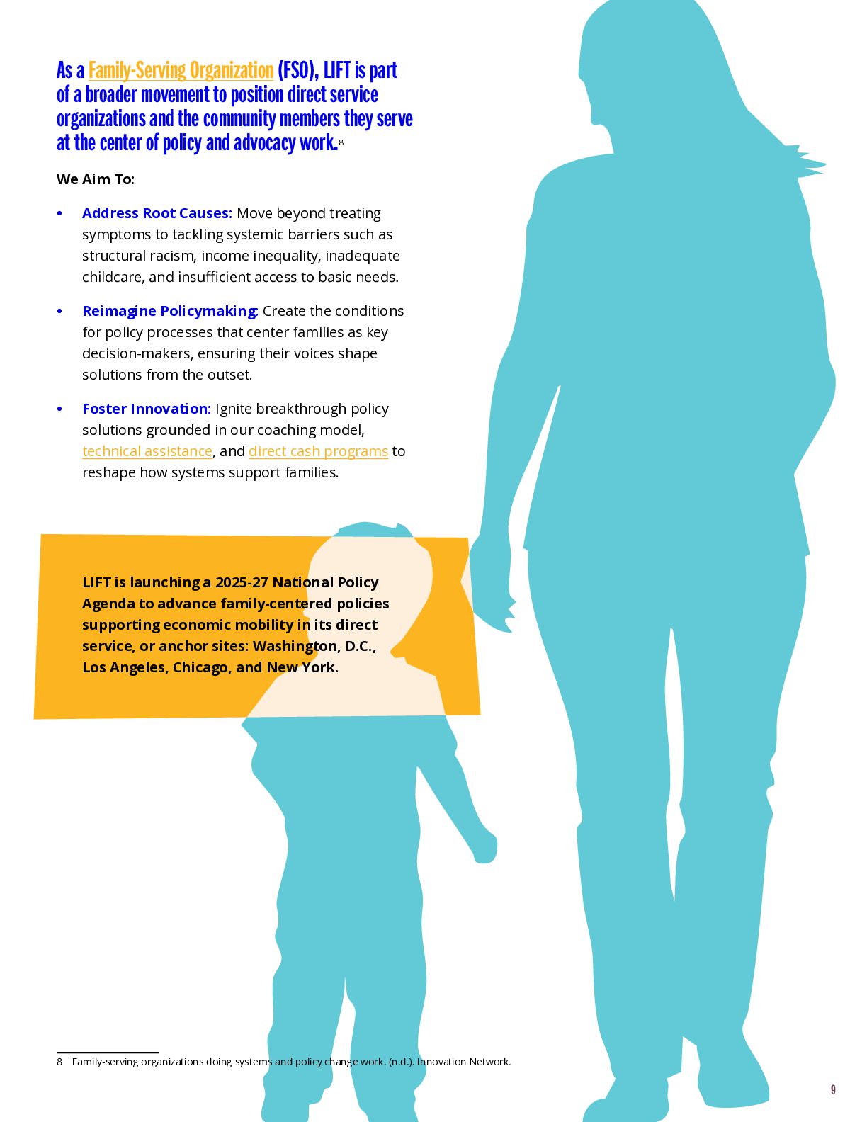 broader movement to position direct service organizations and the community members they serve at the center of policy and advocacy work.8 We Aim To: • Address Root Causes: Move beyond treating symptoms to tackling systemic barriers such as structural racism, income inequality, inadequate childcare, and insufficient access to basic needs. • Reimagine Policymaking: Create the conditions for policy processes that center families as key decision-makers, ensuring their voices shape solutions from the outset. • Foster Innovation: Ignite breakthrough policy solutions grounded in our coaching model, technical assistance, and direct cash programs to reshape how systems support families. 8 Family-serving organizations doing systems and policy change work. (n.d.). Innovation Network. LIFT is launching a 2025-27 National Policy Agenda to advance family-centered policies supporting economic mobility in its direct service, or anchor sites: Washington, D.C., Los Angeles, Chicago, and New York. 9