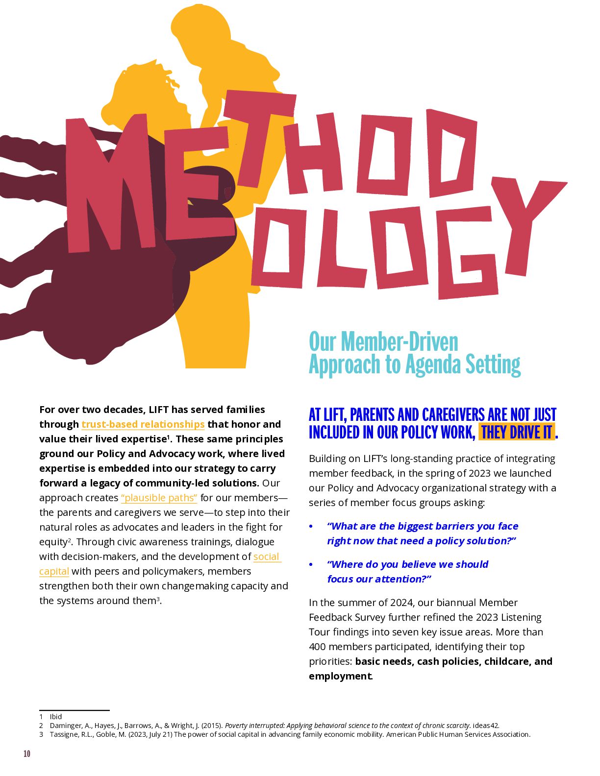 relationships that honor and value their lived expertise1. These same principles ground our Policy and Advocacy work, where lived expertise is embedded into our strategy to carry forward a legacy of community-led solutions. Our approach creates “plausible paths” for our members— the parents and caregivers we serve—to step into their natural roles as advocates and leaders in the fight for equity2. Through civic awareness trainings, dialogue with decision-makers, and the development of social capital with peers and policymakers, members strengthen both their own changemaking capacity and the systems around them3. 1 Ibid 2 Daminger, A., Hayes, J., Barrows, A., & Wright, J. (2015). Poverty interrupted: Applying behavioral science to the context of chronic scarcity. ideas42. 3 Tassigne, R.L., Goble, M. (2023, July 21) The power of social capital in advancing family economic mobility. American Public Human Services Association. AT LIFT, PARENTS AND CAREGIVERS ARE NOT JUST INCLUDED IN OUR POLICY WORK, THEY DRIVE IT . Building on LIFT’s long-standing practice of integrating member feedback, in the spring of 2023 we launched our Policy and Advocacy organizational strategy with a series of member focus groups asking: • “What are the biggest barriers you face right now that need a policy solution?” • “Where do you believe we should focus our attention?” In the summer of 2024, our biannual Member Feedback Survey further refined the 2023 Listening Tour findings into seven key issue areas. More than 400 members participated, identifying their top priorities: basic needs, cash policies, childcare, and employment. Our Member-Driven Approach to Agenda Setting 10