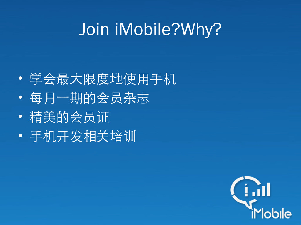 Join iMobile?Why? • 学会最⼤大限度地使⽤用⼿手机 • 每月⼀一期的会员杂志 • 精美的会员证 • ⼿手机开发相关培训