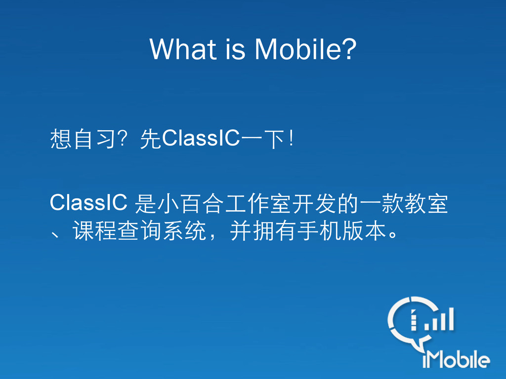 What is Mobile? 想⾃自习?先ClassIC⼀一下! ClassIC 是⼩小百合⼯工作室开发的⼀一款教室 、课程查询系统,并拥有⼿手机版本。