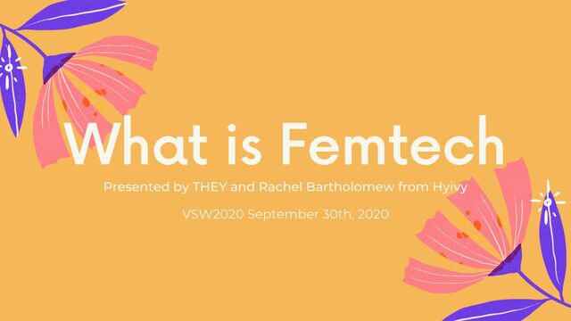 • 16: 35 - Introduction - 5 min • 16: 40 - What is Femtech - 15 min • 16:55 - Fireside Chat - 20 min with Founder & CEO of Hyivy Rachel Bartholomew • 17:10 - Q&A - 15 min • 17:20 - Closing - 5 min