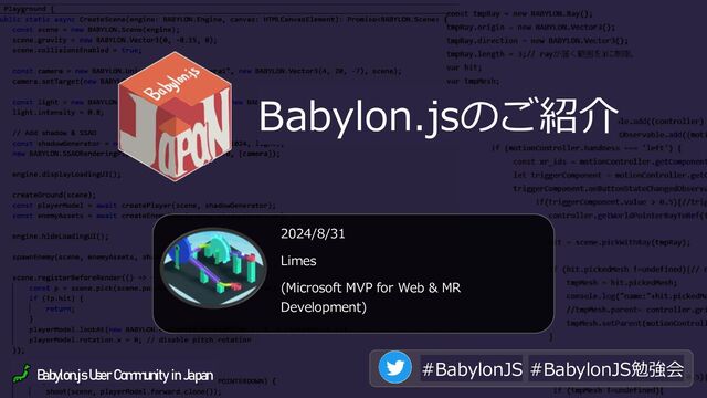 UnityとVRを中心に活動。2018年頃から Babylon.jsを知って情報発信を継続。最近は Babylon.js+WebXR関連で活動中 o Babylon.js勉強会の共同主催者 o 2児の父で休日は公園や図書館に行くことが 多い o Blog : Cross Road https://www.crossroad-tech.com/ Development Technologies (Unity) : 2016/10-2018/7 Windows Development (Windows Mixed Reality) : 2018/7-2022/8 Mixed Reality (MR Development) : 2022/9-2024/6, Microsoft MVP for Mixed Reality and Developer Technologies : 2024/7-