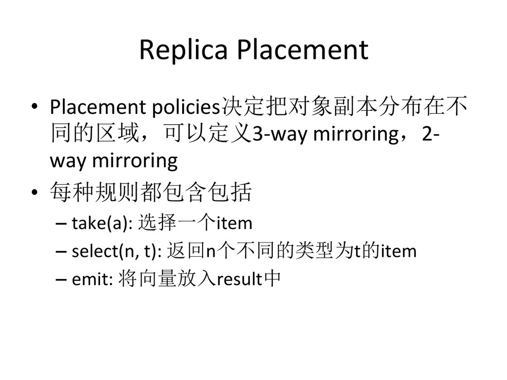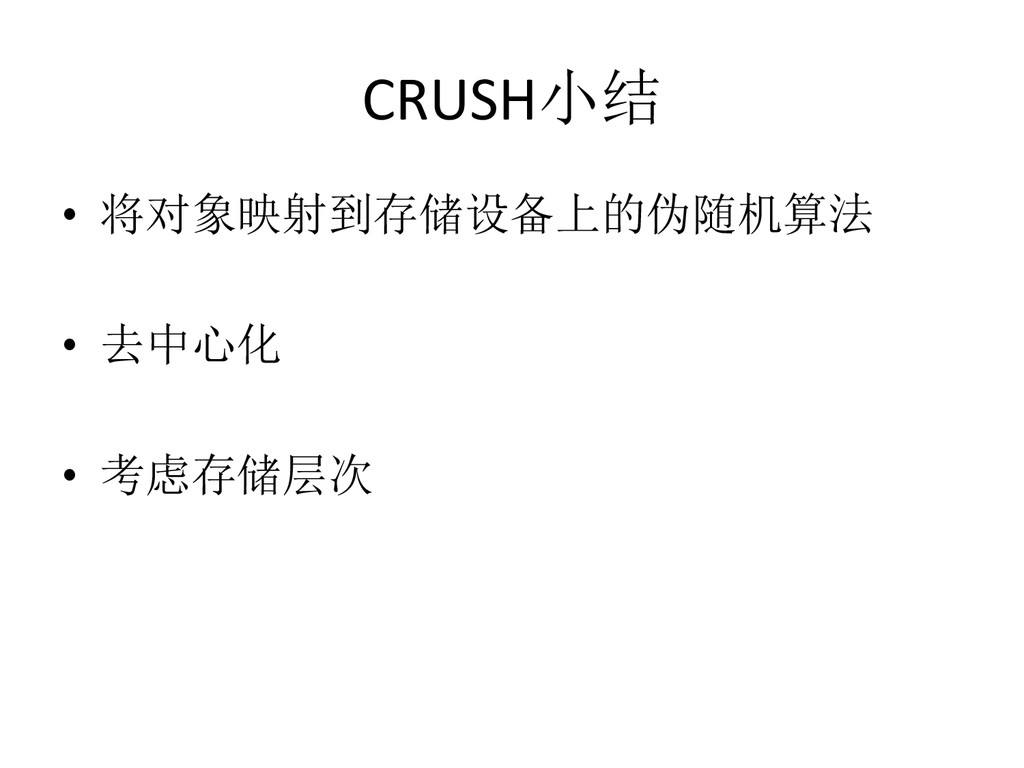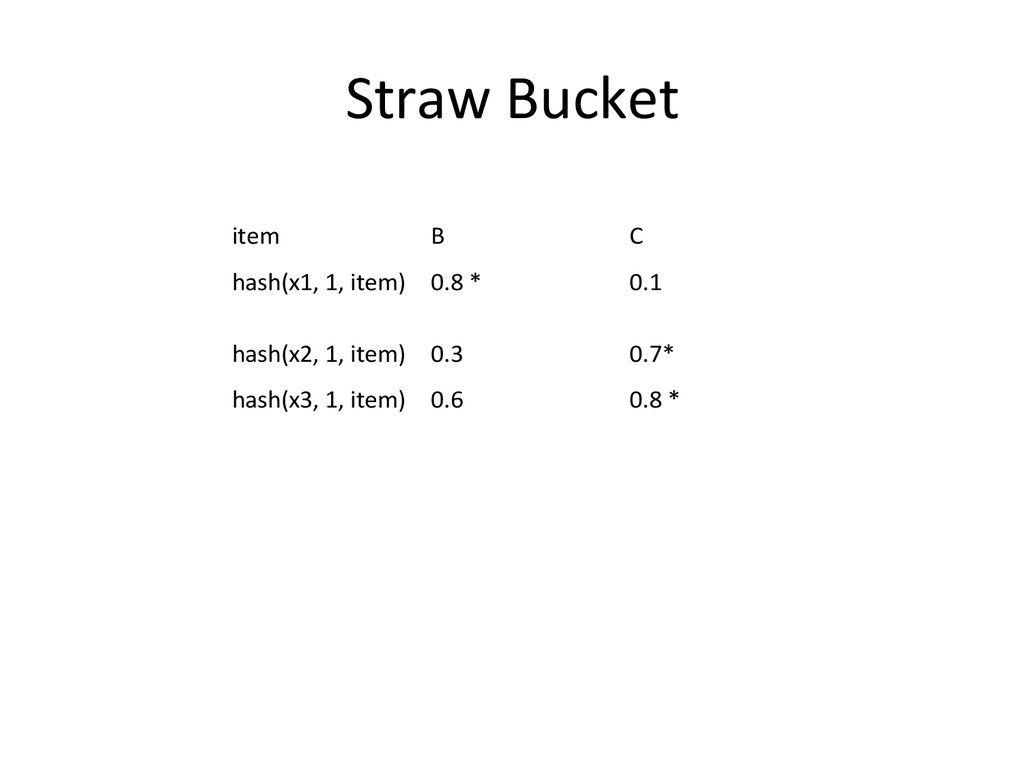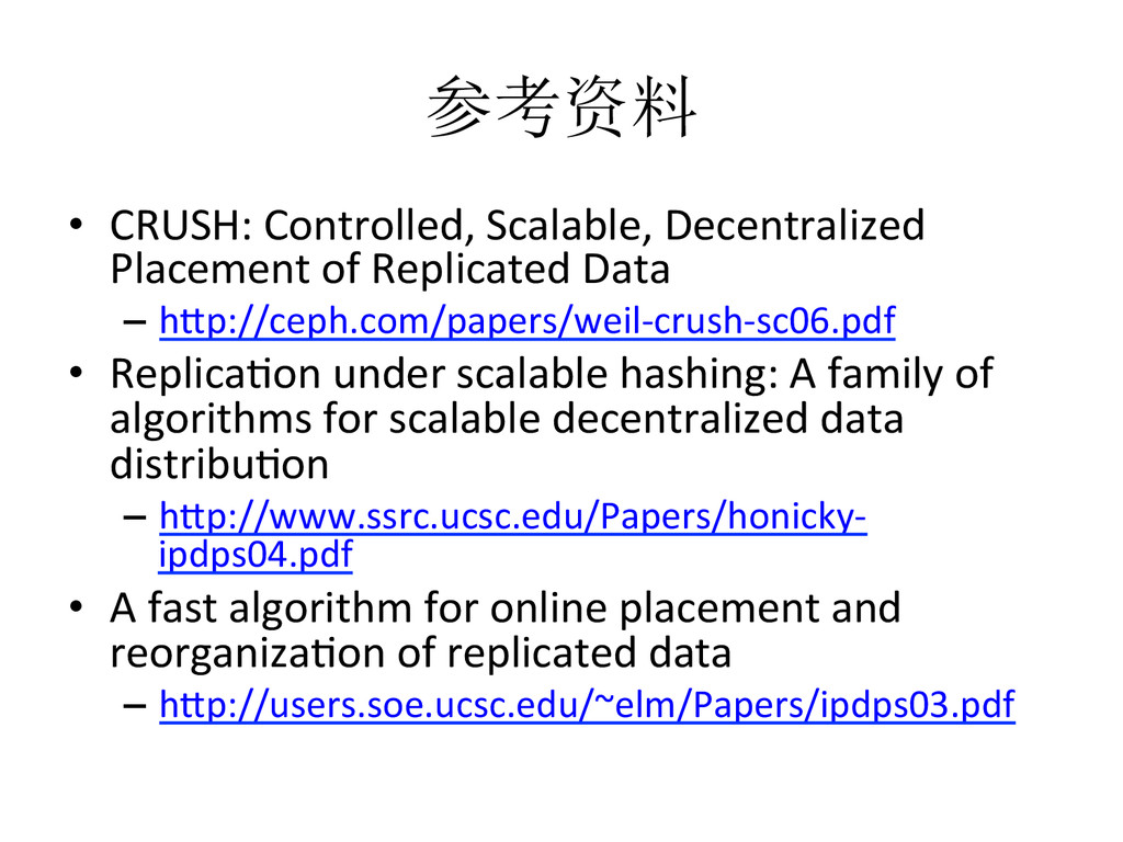 Data – hdp://ceph.com/papers/weil-‐crush-‐sc06.pdf • Replicaeon under scalable hashing: A family of algorithms for scalable decentralized data distribueon – hdp://www.ssrc.ucsc.edu/Papers/honicky-‐ ipdps04.pdf • A fast algorithm for online placement and reorganizaeon of replicated data – hdp://users.soe.ucsc.edu/~elm/Papers/ipdps03.pdf