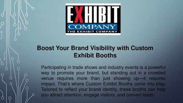 features, custom exhibit booths help you make a stronger impact, generate more leads, and ultimately deliver a better return on your investment. Conclusion By choosing custom exhibit booths, you position your brand to succeed in competitive trade show environments. Make a lasting impression, connect with your audience, and turn event foot traffic into long-term business opportunities.