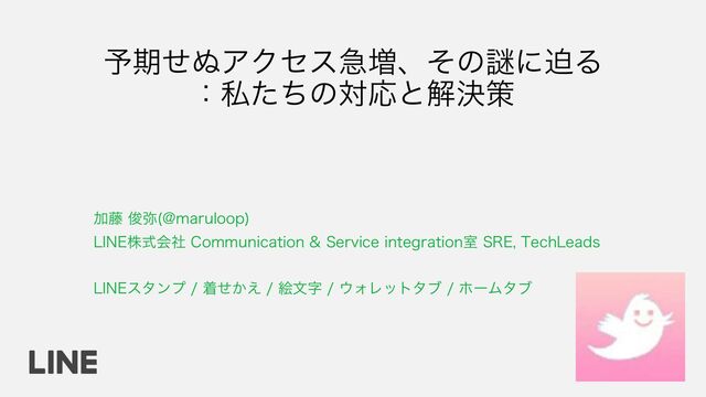 加藤 俊弥(@maruloop) LINE株式会社 Communication & Service integration室 SRE, TechLeads LINEスタンプ / 着せかえ / 絵文字 / ウォレットタブ / ホームタブ