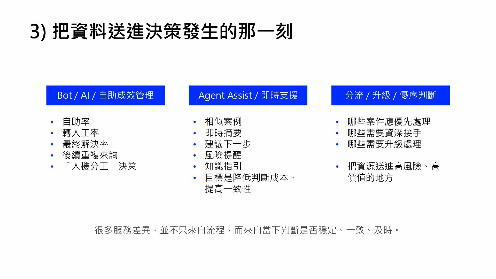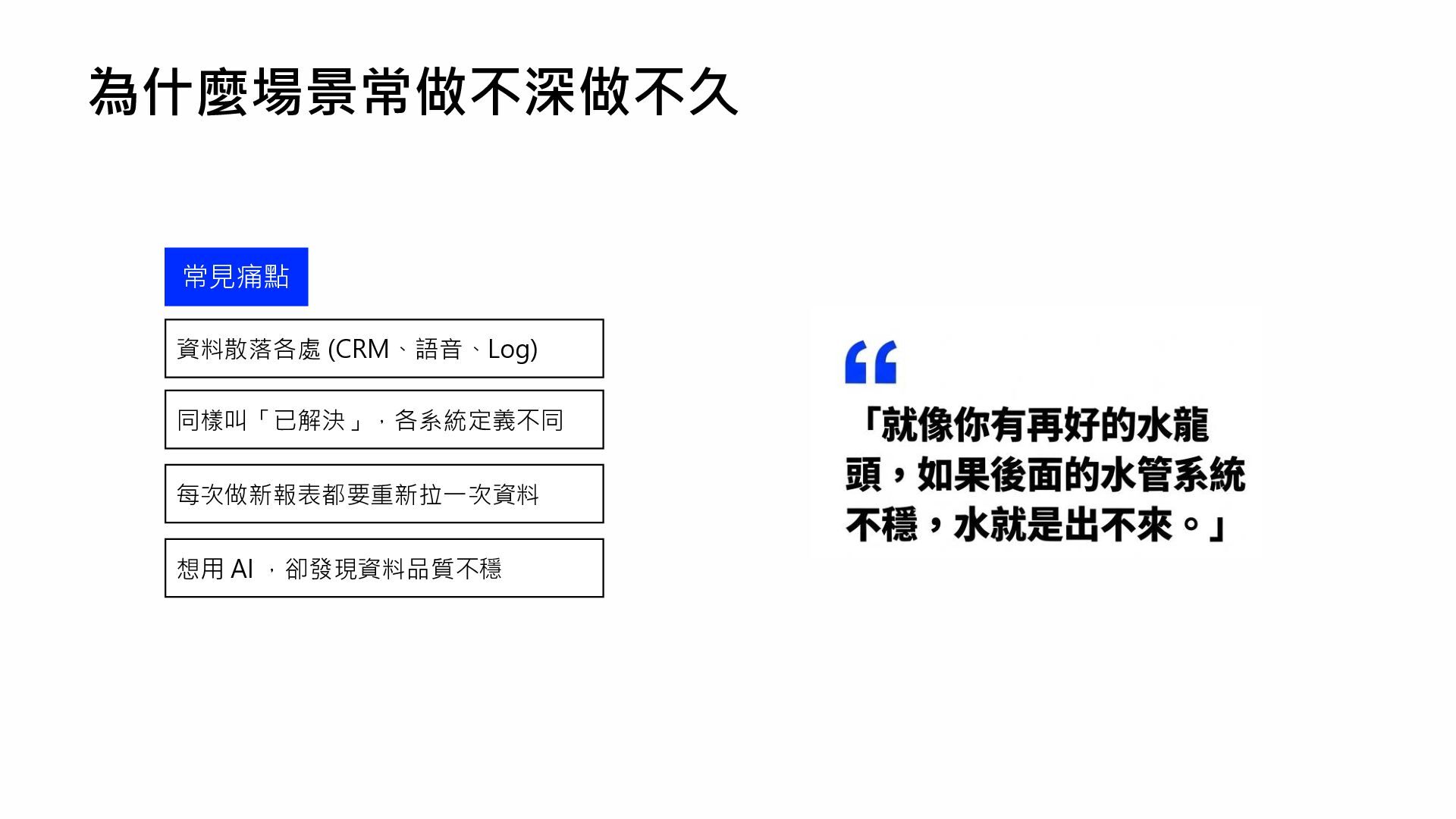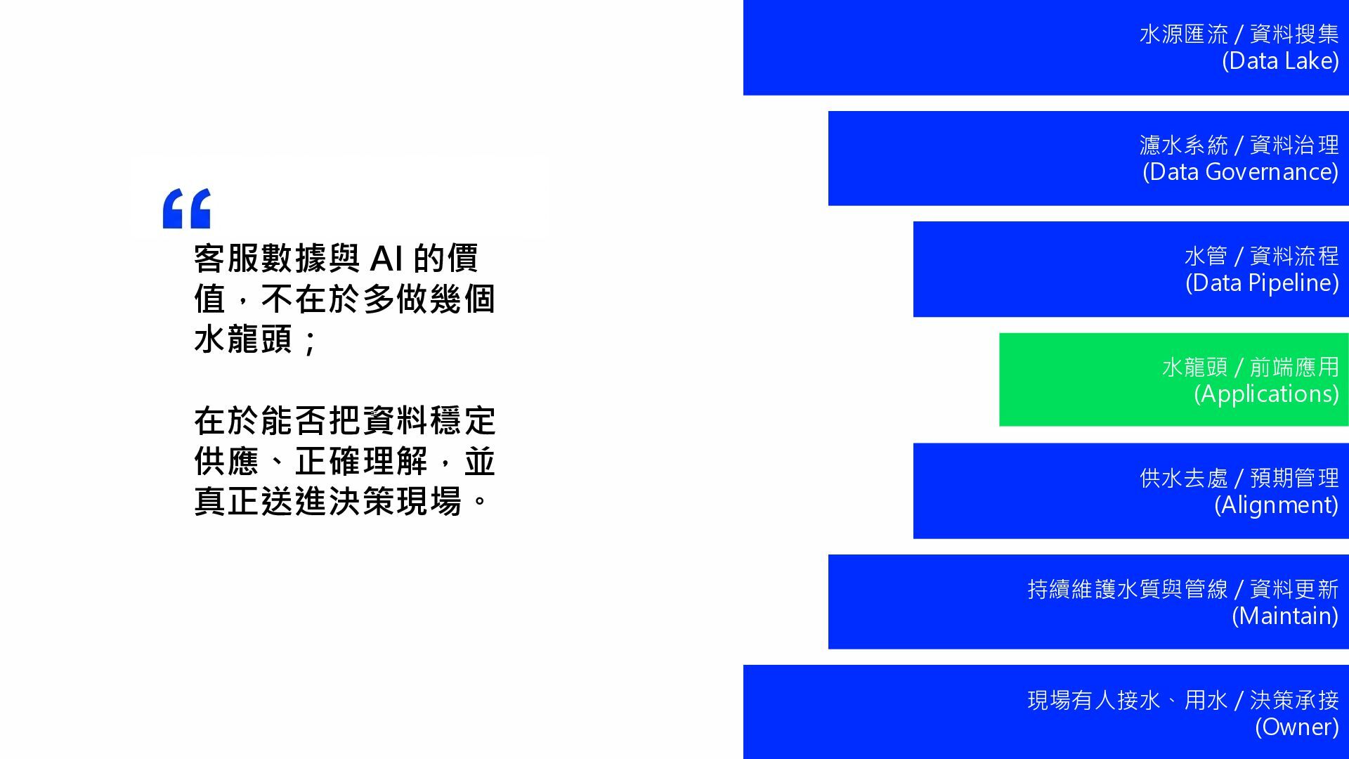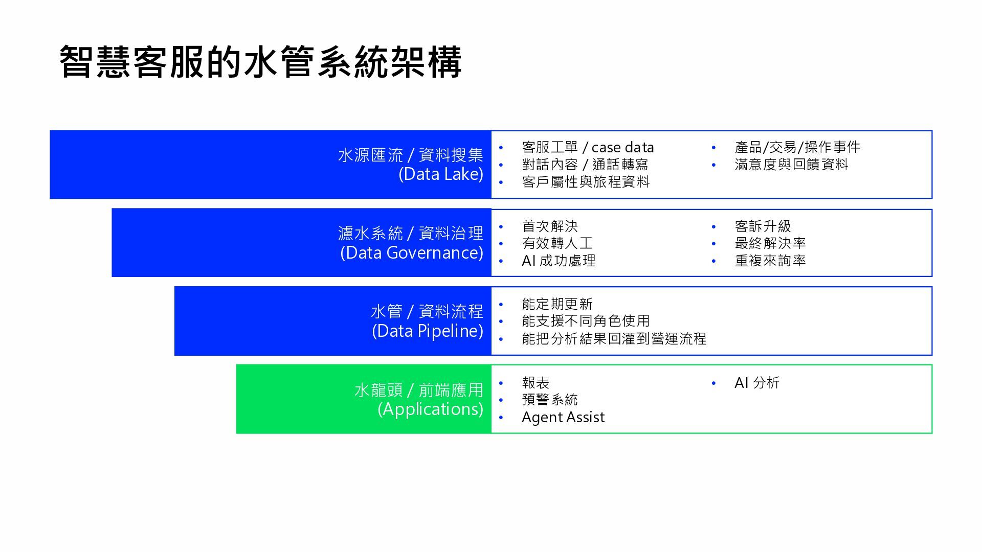 data • 對話內容 / 通話轉寫 • 客戶屬性與旅程資料 • 產品/交易/操作事件 • 滿意度與回饋資料 濾水系統 / 資料治理 (Data Governance) • 首次解決 • 有效轉人工 • AI 成功處理 • 客訴升級 • 最終解決率 • 重複來詢率 水管 / 資料流程 (Data Pipeline) • 能定期更新 • 能支援不同角色使用 • 能把分析結果回灌到營運流程 水龍頭 / 前端應用 (Applications) • 報表 • 預警系統 • Agent Assist • AI 分析