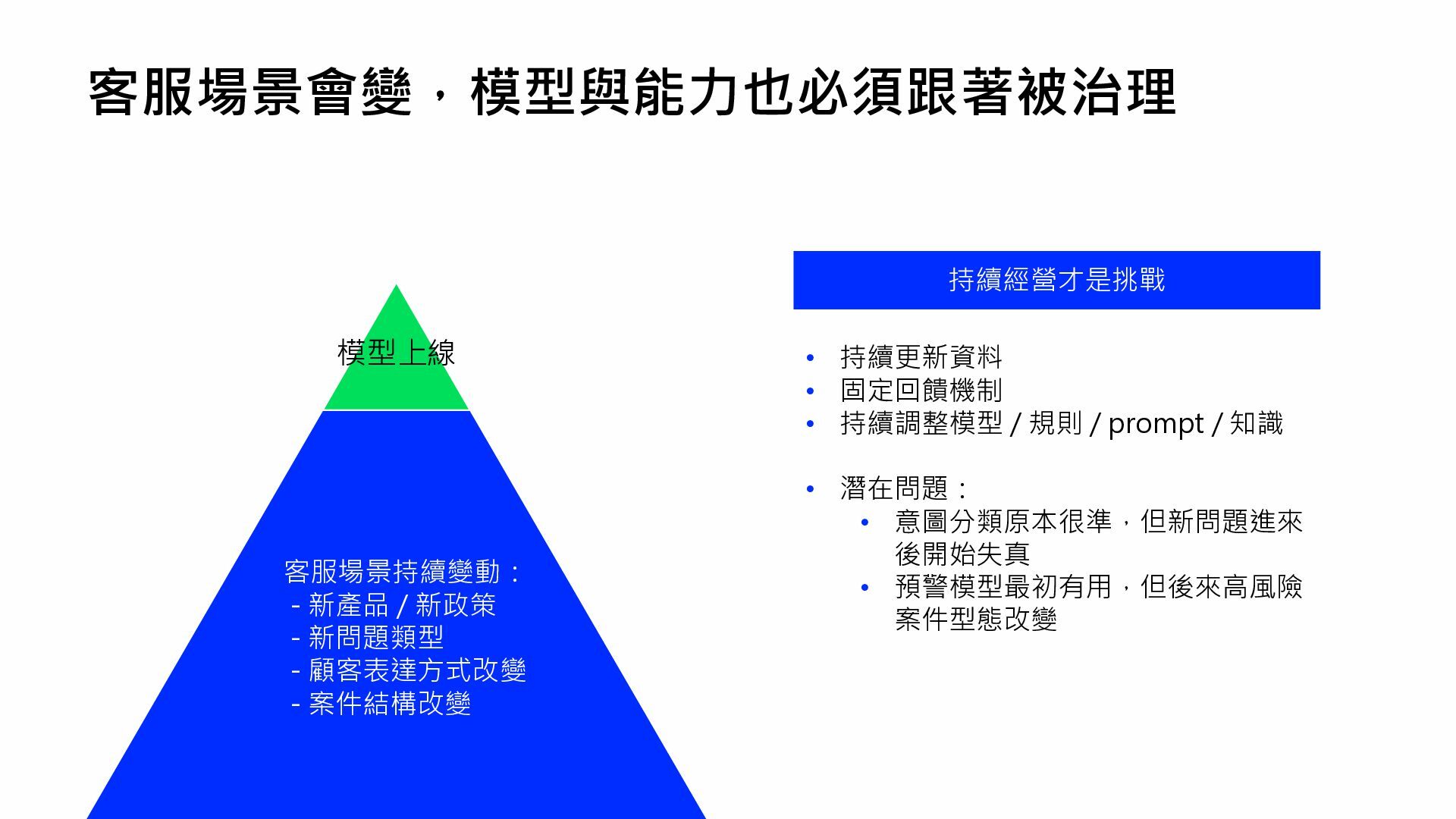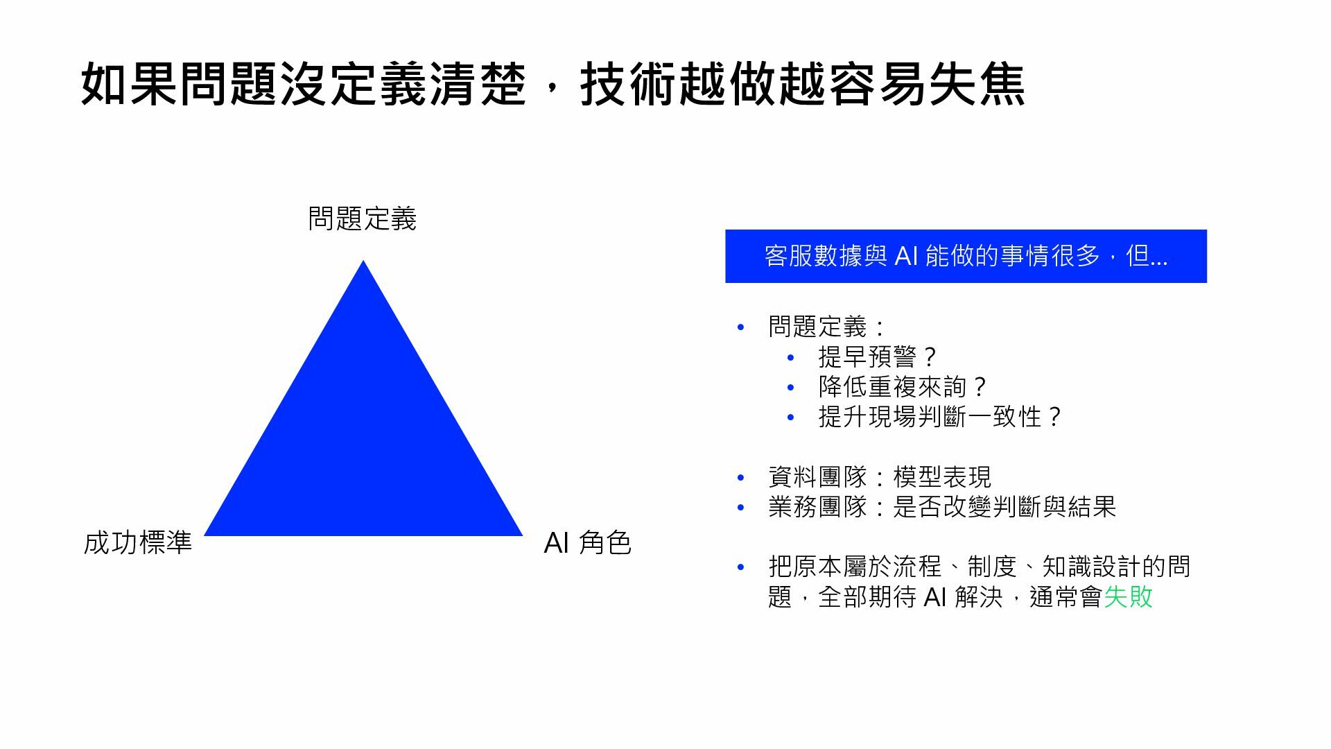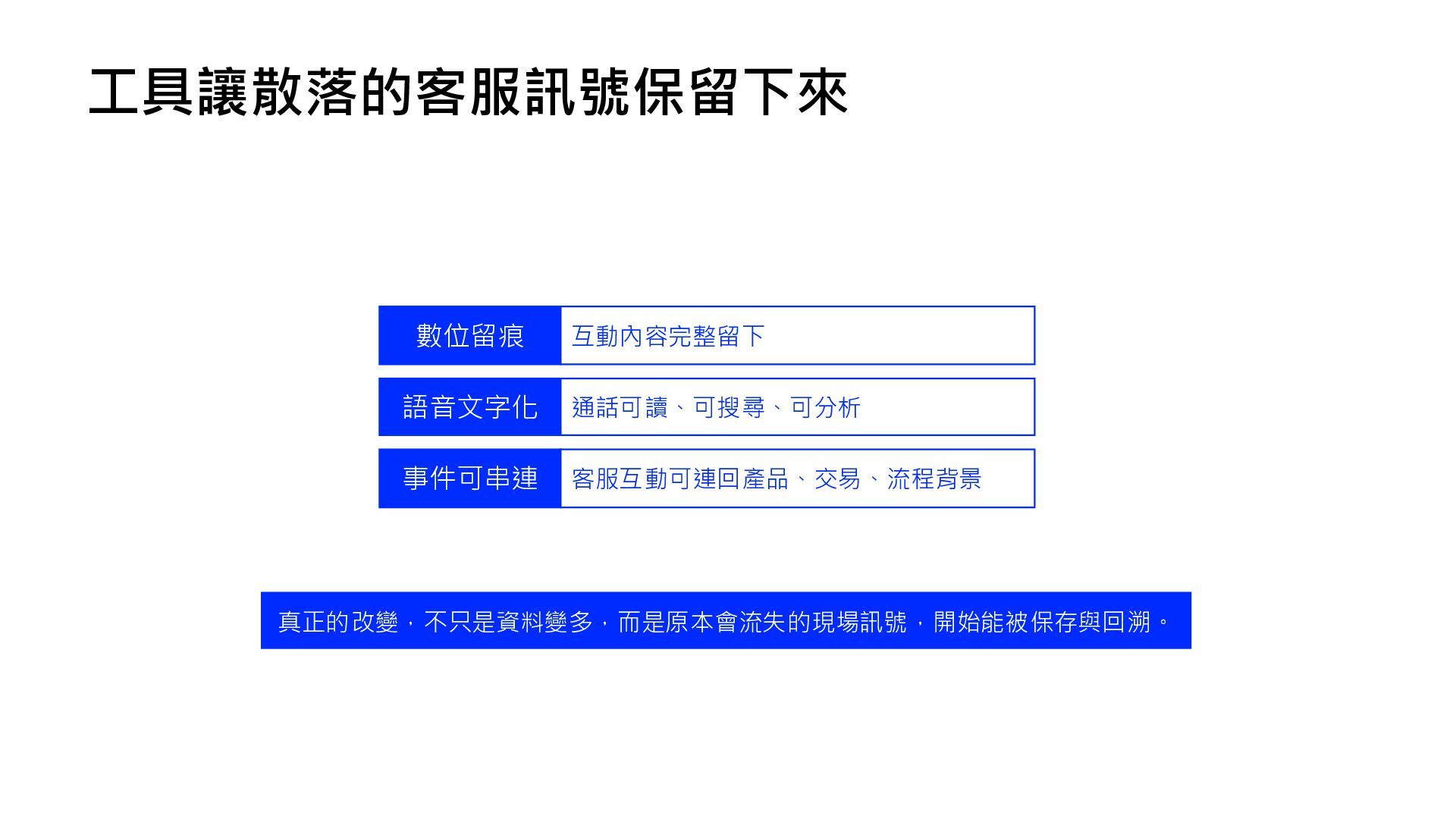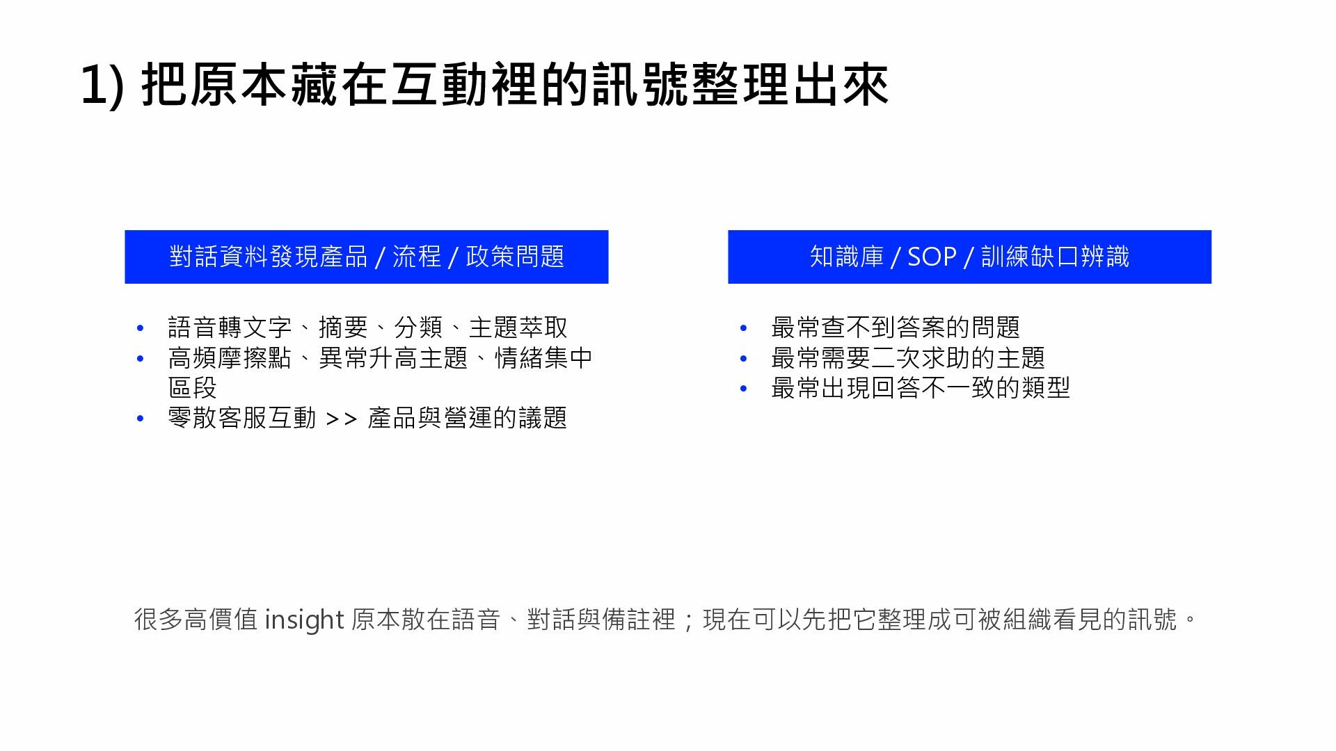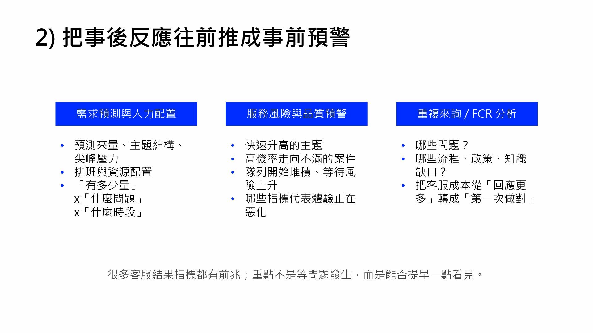 data • 對話內容 / 通話轉寫 • 客戶屬性與旅程資料 • 產品/交易/操作事件 • 滿意度與回饋資料 濾水系統 / 資料治理 (Data Governance) • 首次解決 • 有效轉人工 • AI 成功處理 • 客訴升級 • 最終解決率 • 重複來詢率 水管 / 資料流程 (Data Pipeline) • 能定期更新 • 能支援不同角色使用 • 能把分析結果回灌到營運流程 水龍頭 / 前端應用 (Applications) • 報表 • 預警系統 • Agent Assist • AI 分析