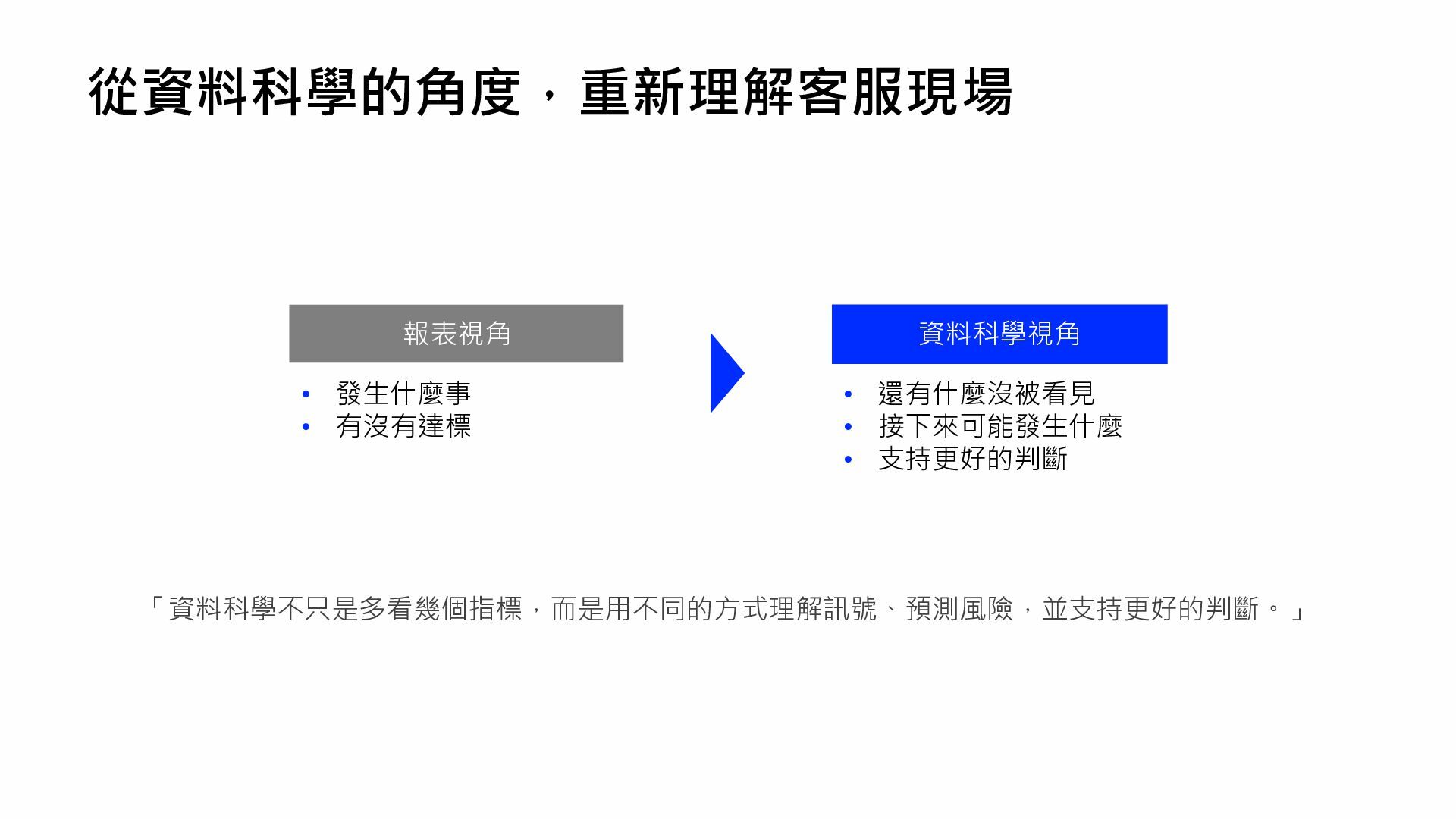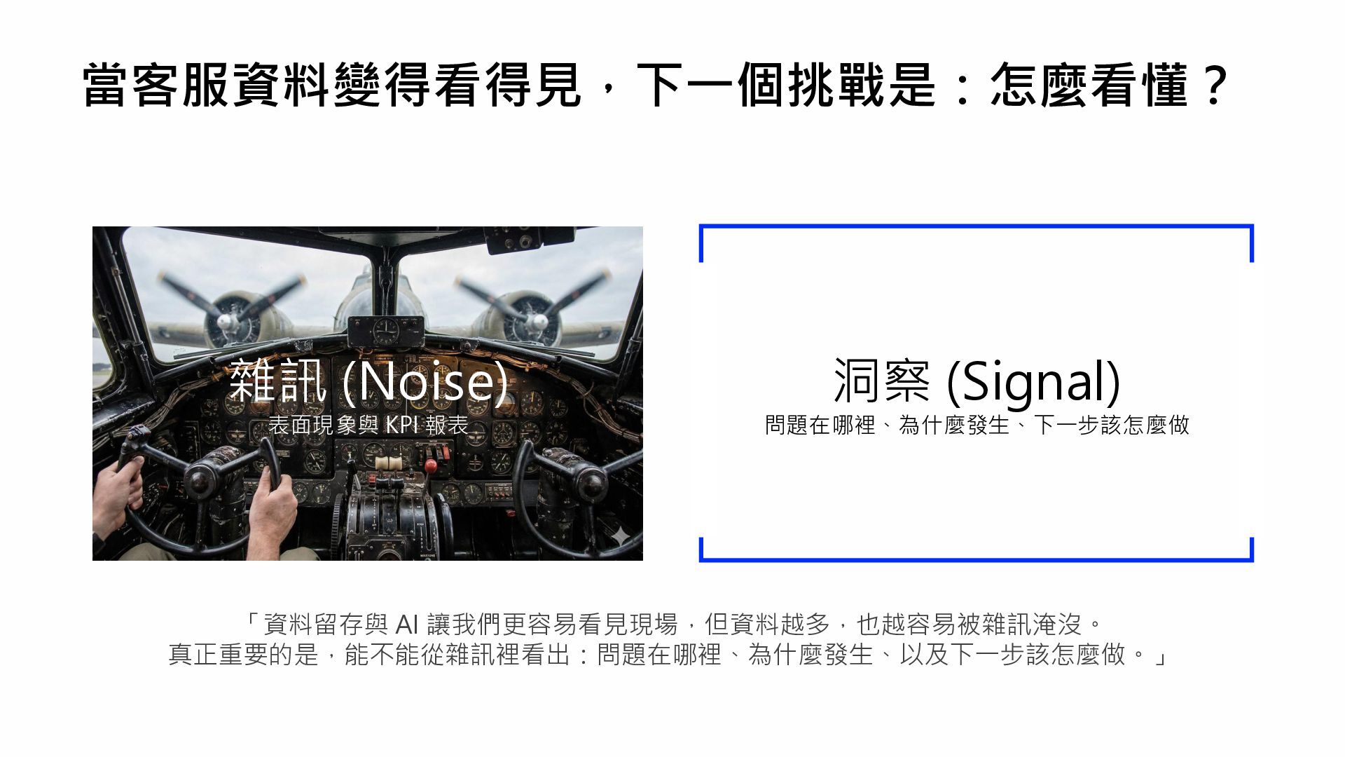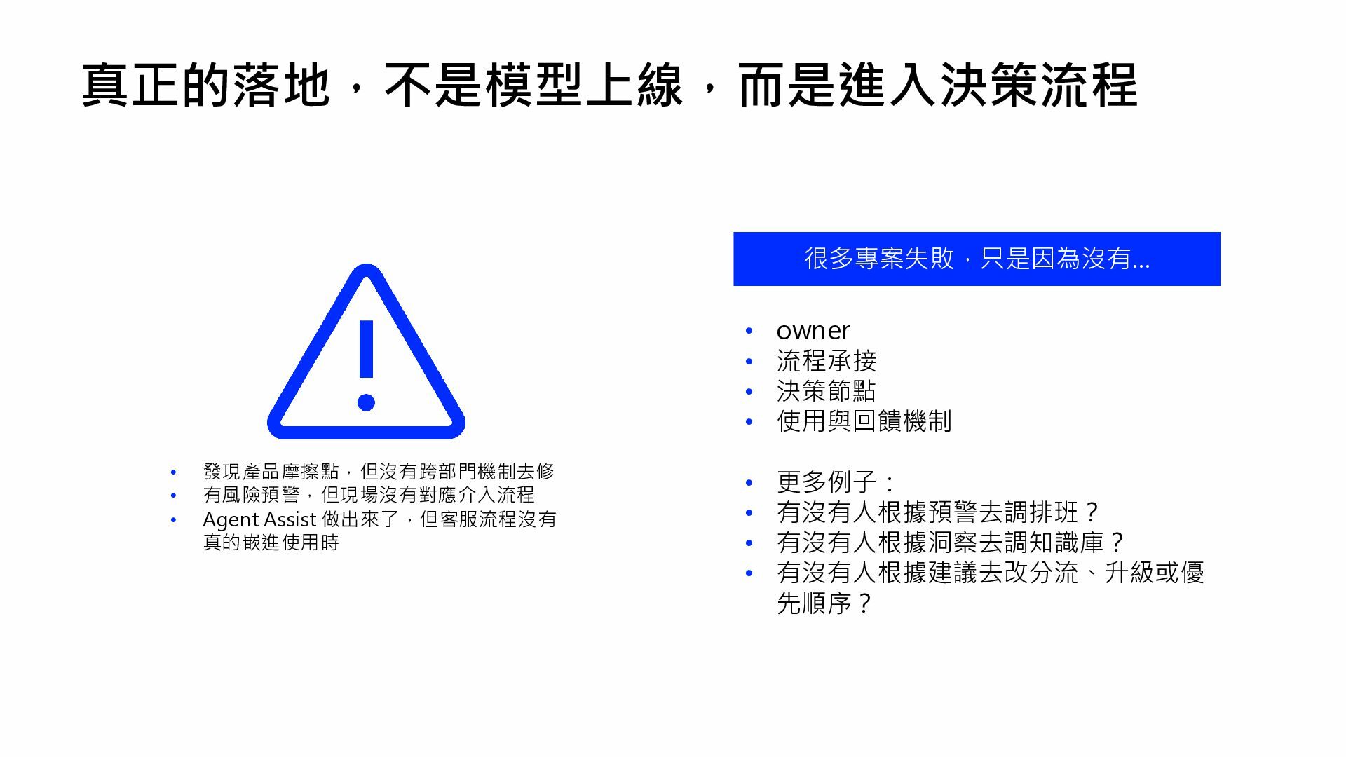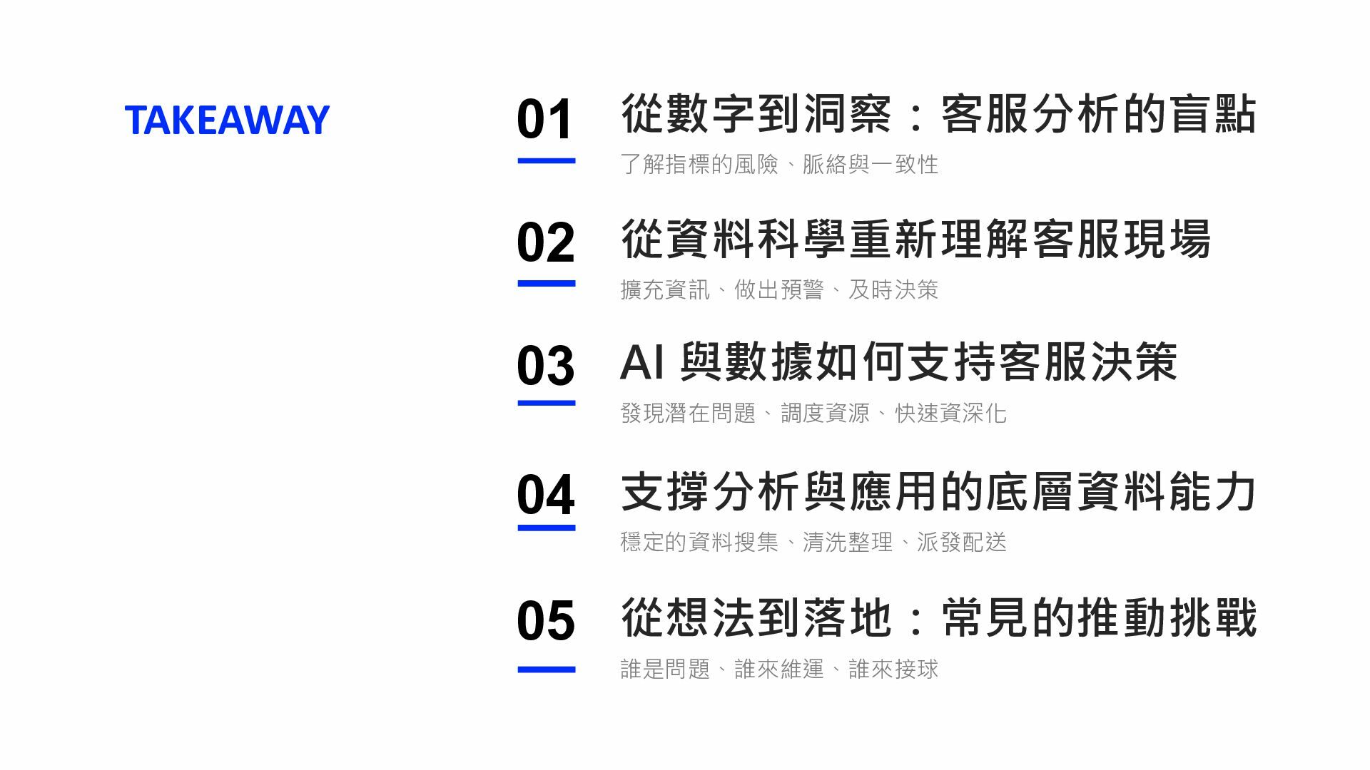 data • 對話內容 / 通話轉寫 • 客戶屬性與旅程資料 • 產品/交易/操作事件 • 滿意度與回饋資料 濾水系統 / 資料治理 (Data Governance) • 首次解決 • 有效轉人工 • AI 成功處理 • 客訴升級 • 最終解決率 • 重複來詢率 水管 / 資料流程 (Data Pipeline) • 能定期更新 • 能支援不同角色使用 • 能把分析結果回灌到營運流程 水龍頭 / 前端應用 (Applications) • 報表 • 預警系統 • Agent Assist • AI 分析