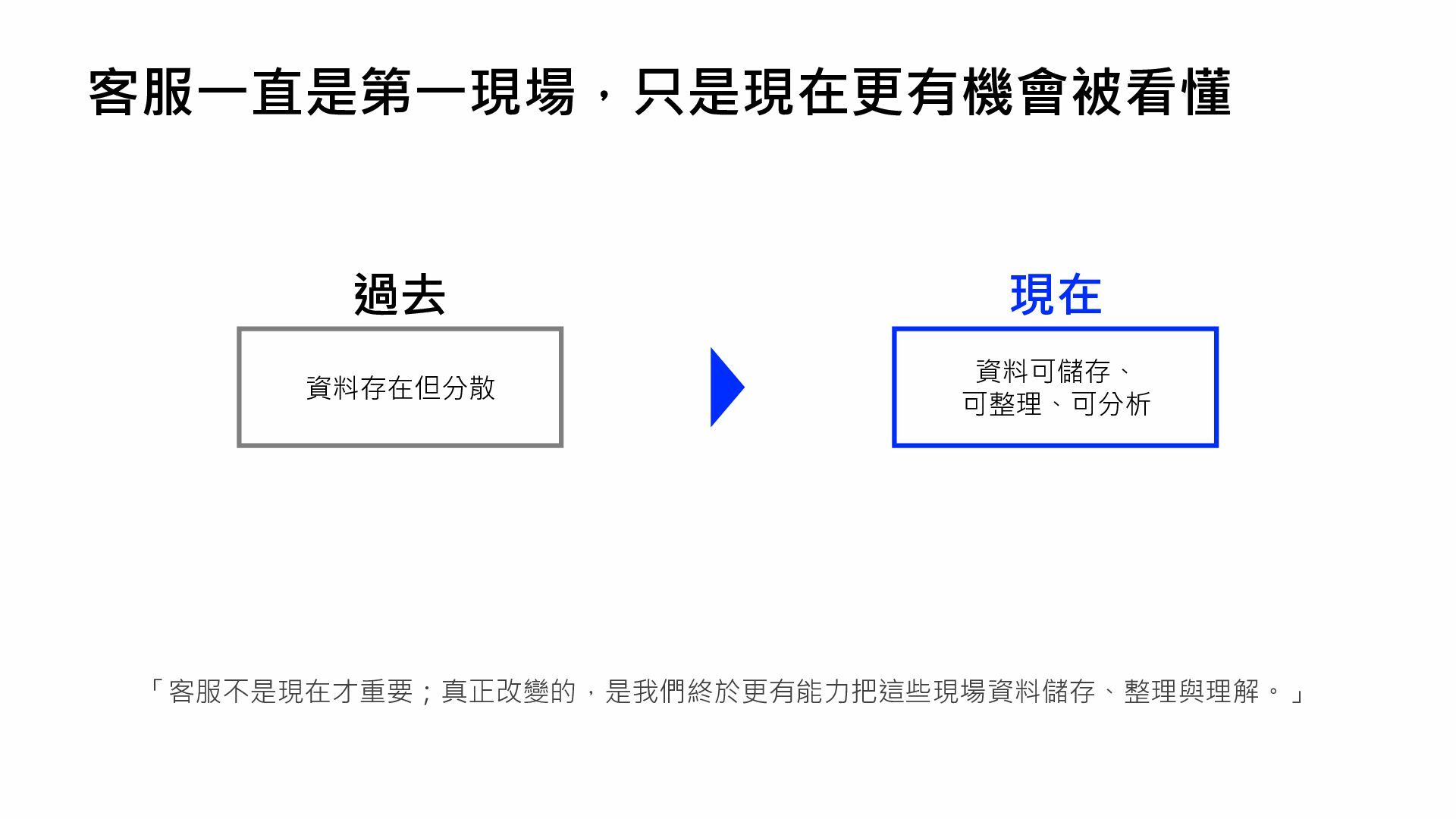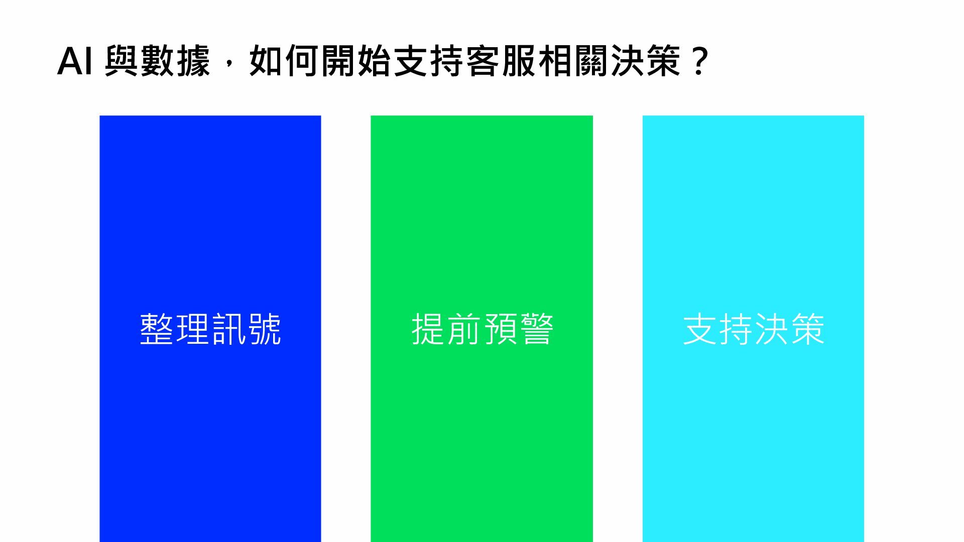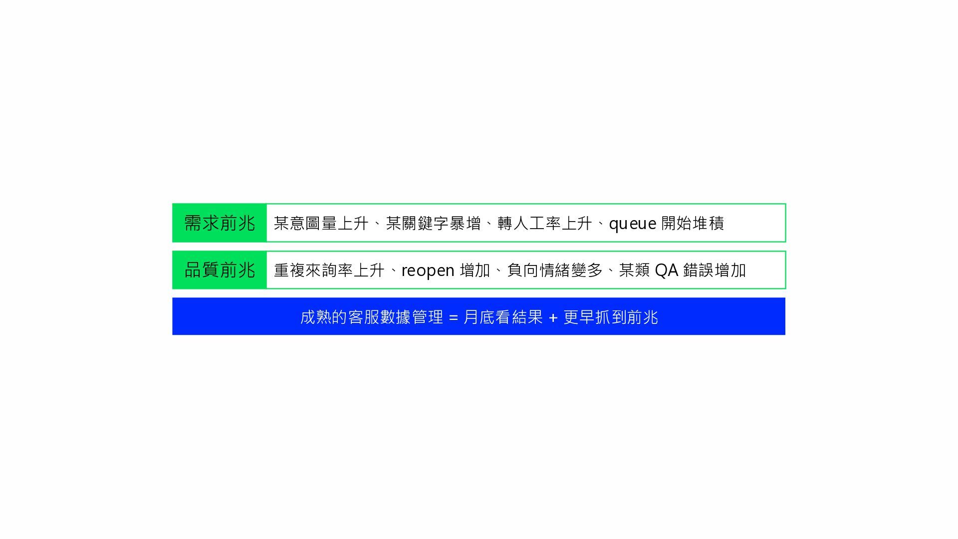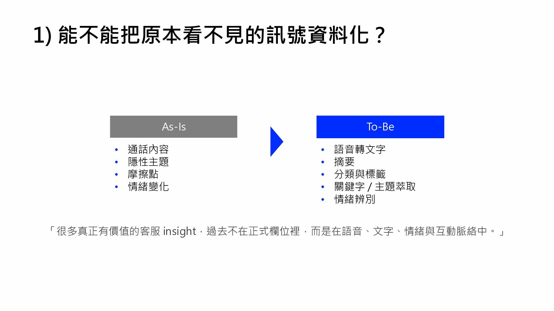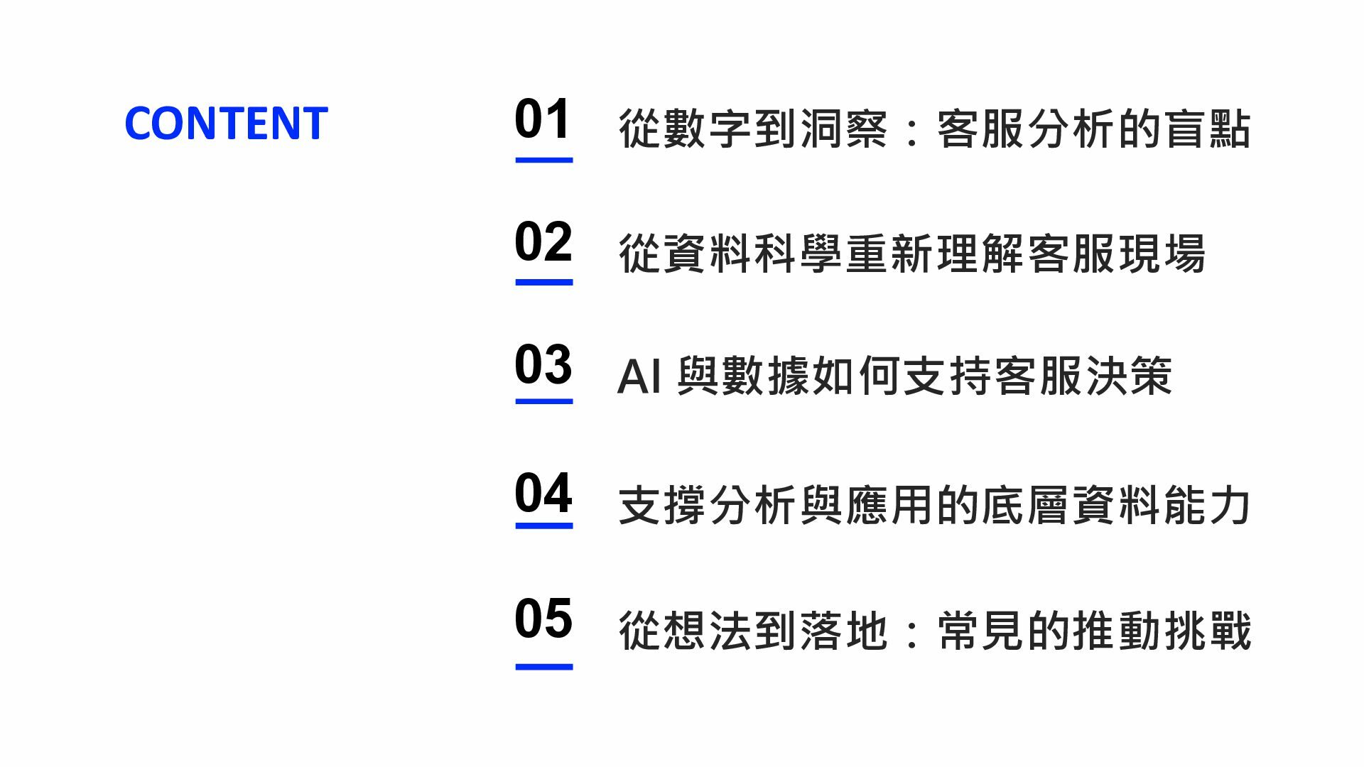 data • 對話內容 / 通話轉寫 • 客戶屬性與旅程資料 • 產品/交易/操作事件 • 滿意度與回饋資料 濾水系統 / 資料治理 (Data Governance) • 首次解決 • 有效轉人工 • AI 成功處理 • 客訴升級 • 最終解決率 • 重複來詢率 水管 / 資料流程 (Data Pipeline) • 能定期更新 • 能支援不同角色使用 • 能把分析結果回灌到營運流程 水龍頭 / 前端應用 (Applications) • 報表 • 預警系統 • Agent Assist • AI 分析