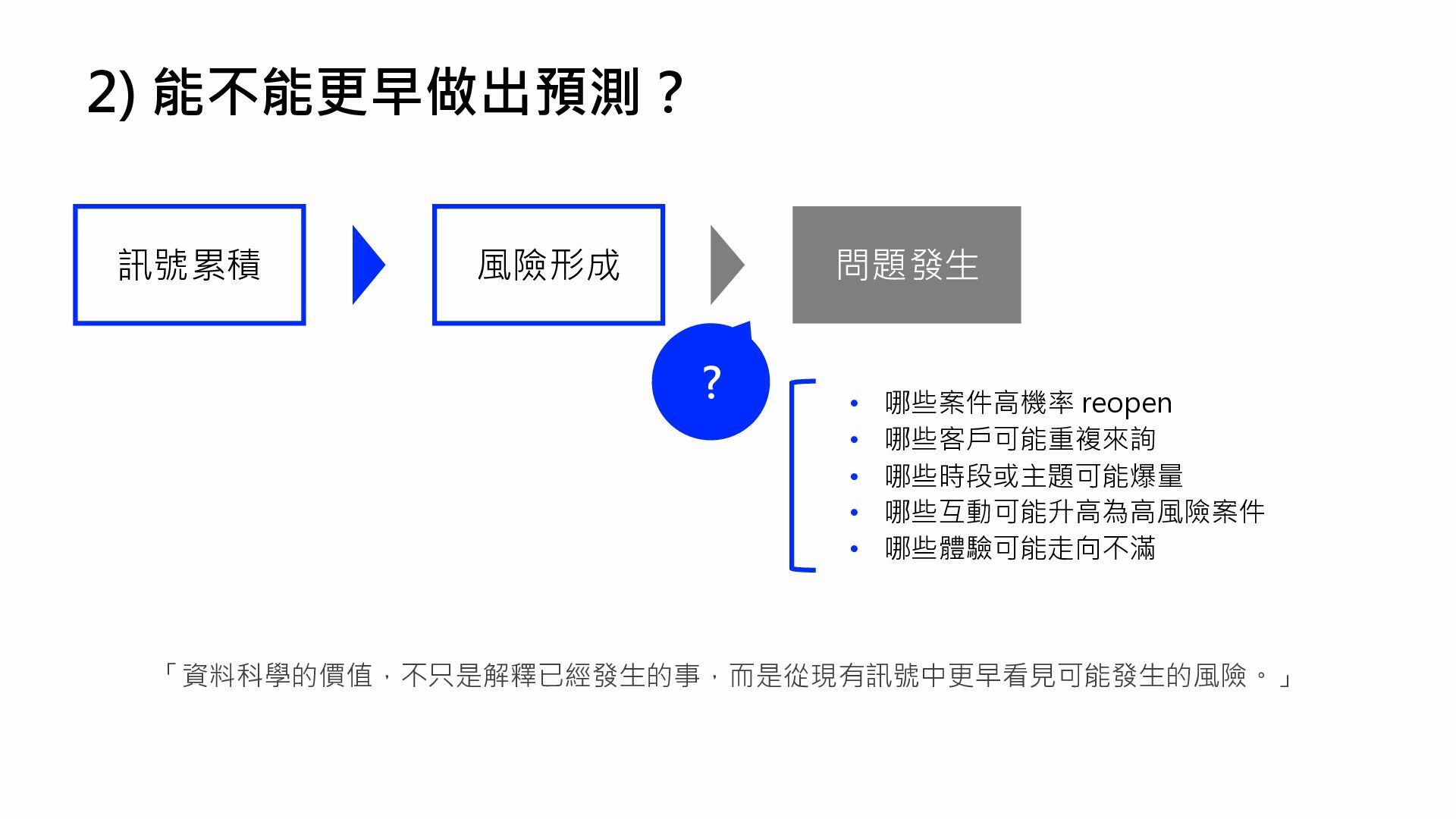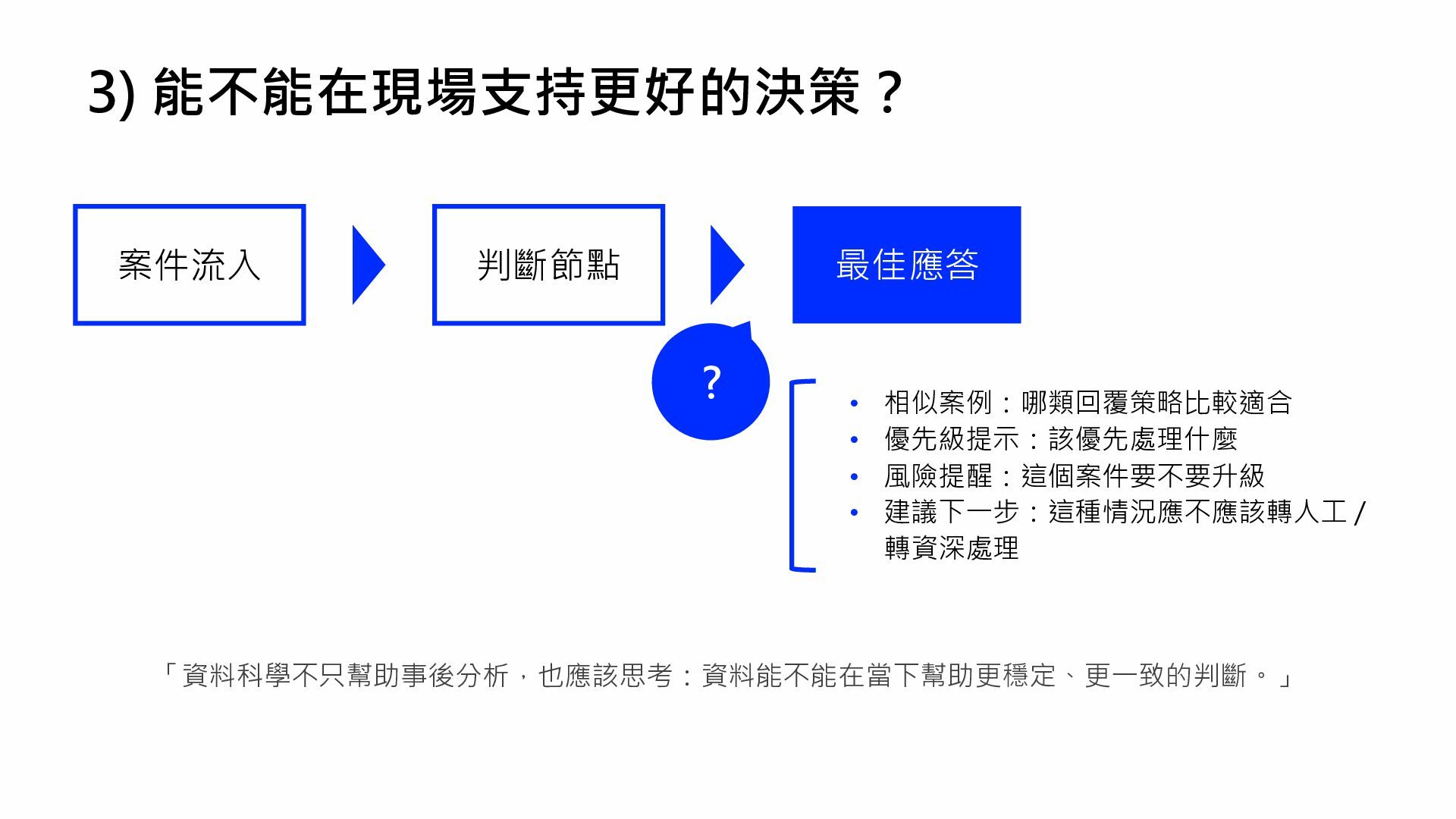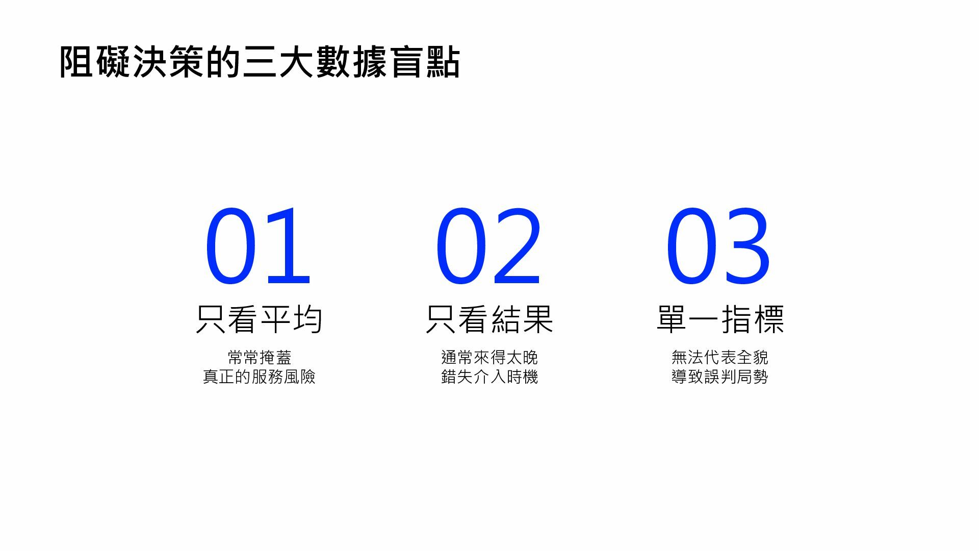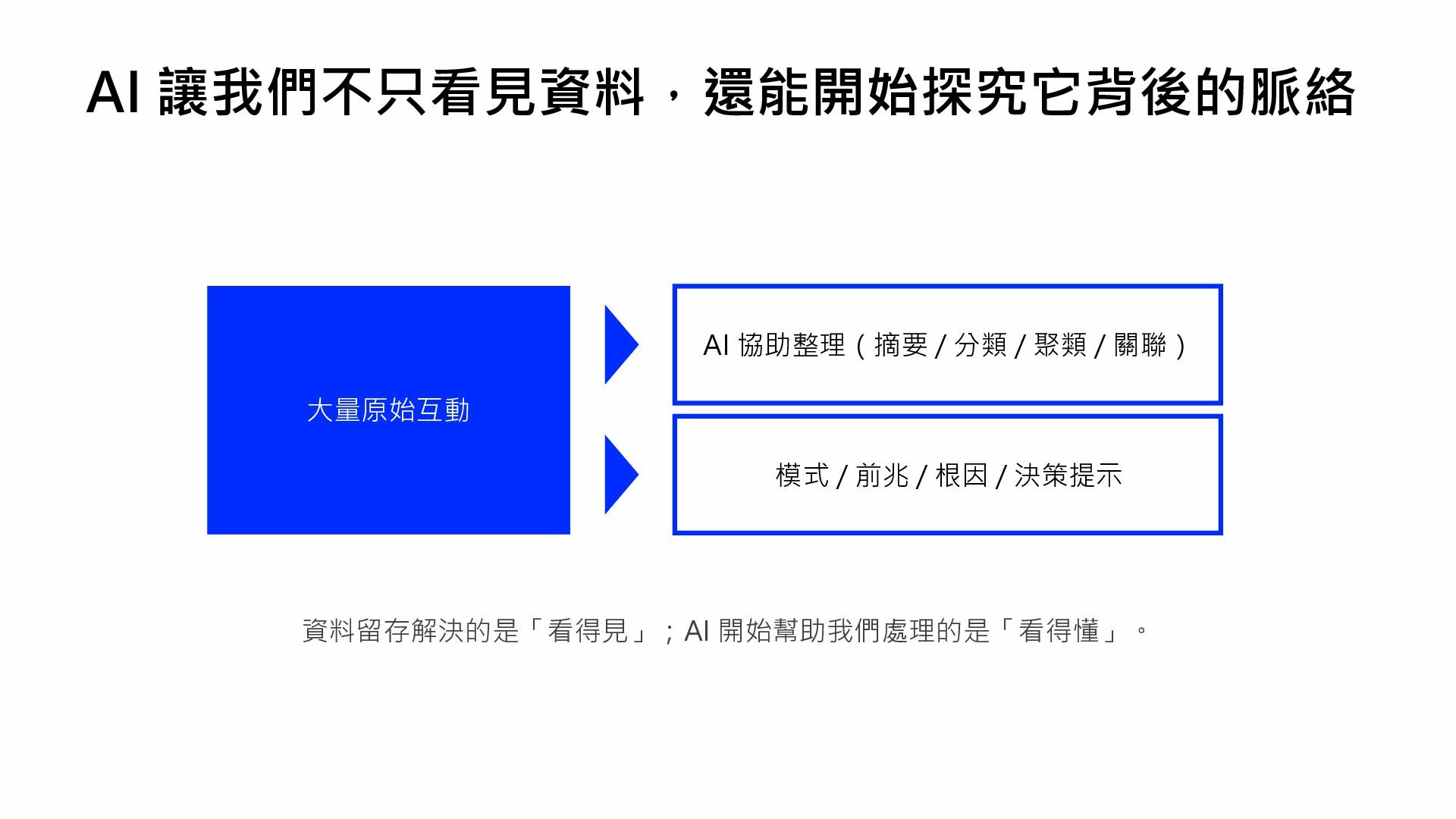 data • 對話內容 / 通話轉寫 • 客戶屬性與旅程資料 • 產品/交易/操作事件 • 滿意度與回饋資料 濾水系統 / 資料治理 (Data Governance) • 首次解決 • 有效轉人工 • AI 成功處理 • 客訴升級 • 最終解決率 • 重複來詢率 水管 / 資料流程 (Data Pipeline) • 能定期更新 • 能支援不同角色使用 • 能把分析結果回灌到營運流程 水龍頭 / 前端應用 (Applications) • 報表 • 預警系統 • Agent Assist • AI 分析