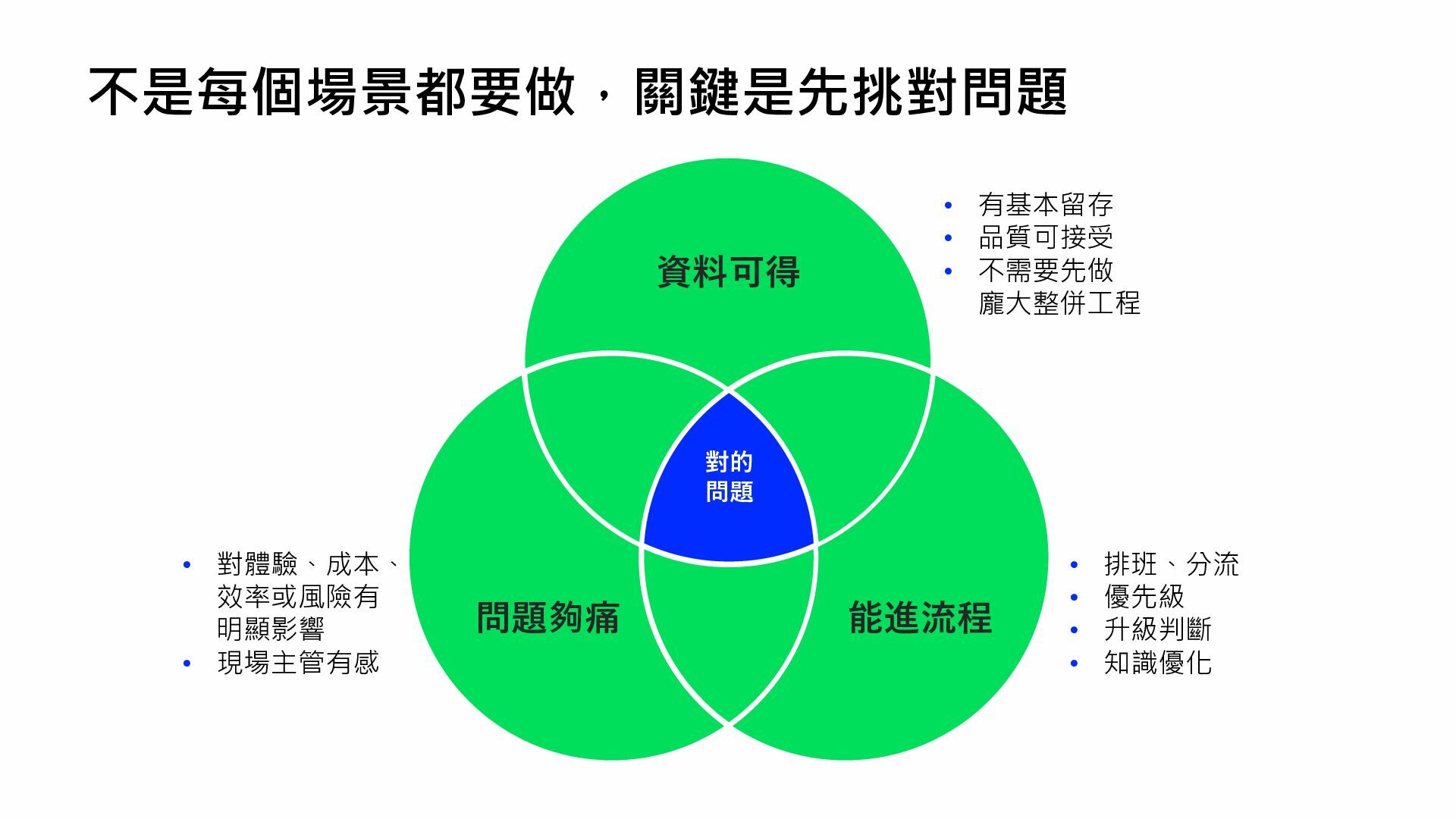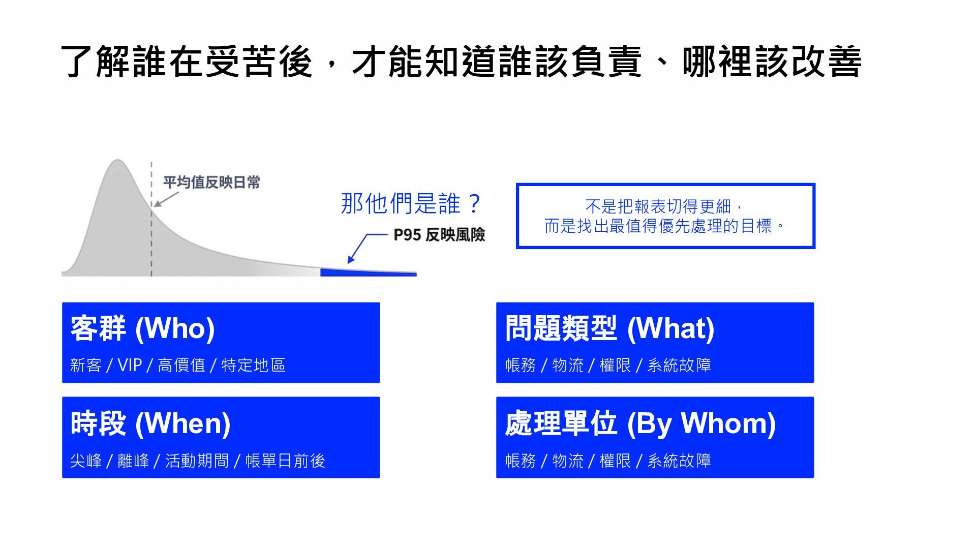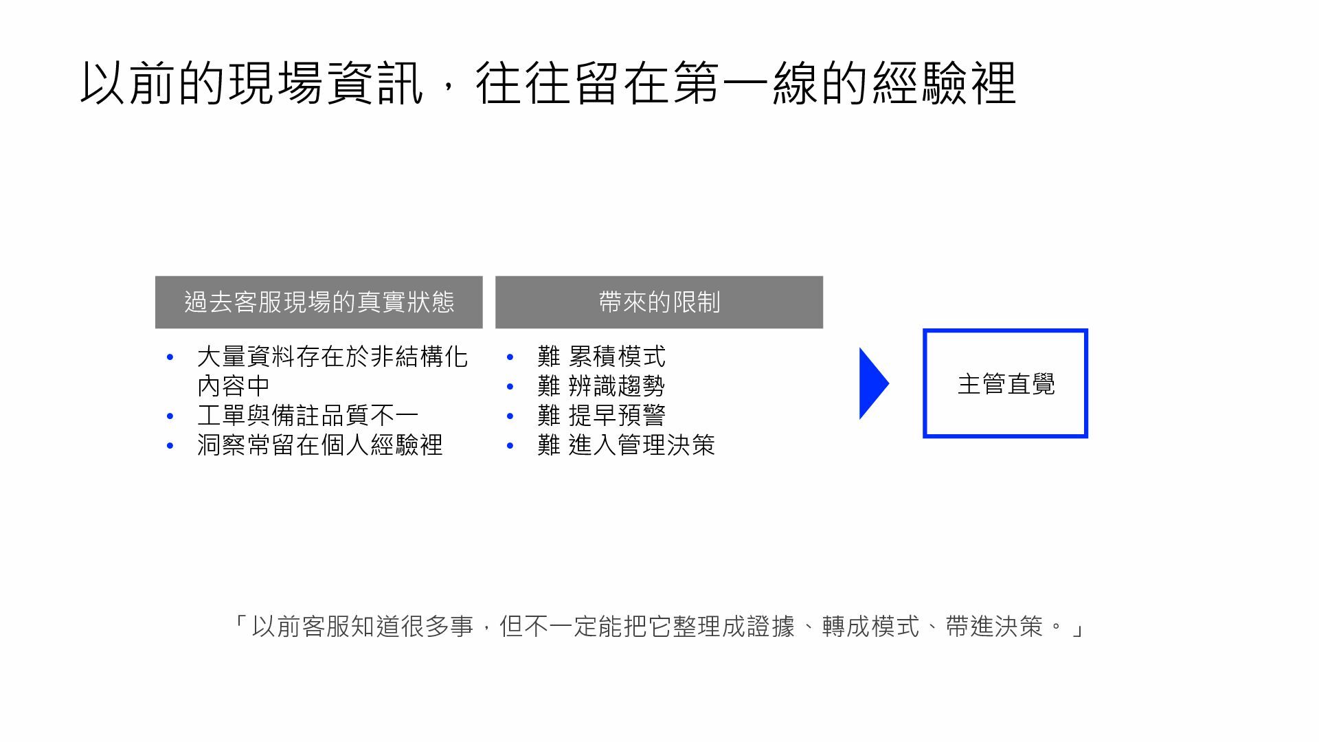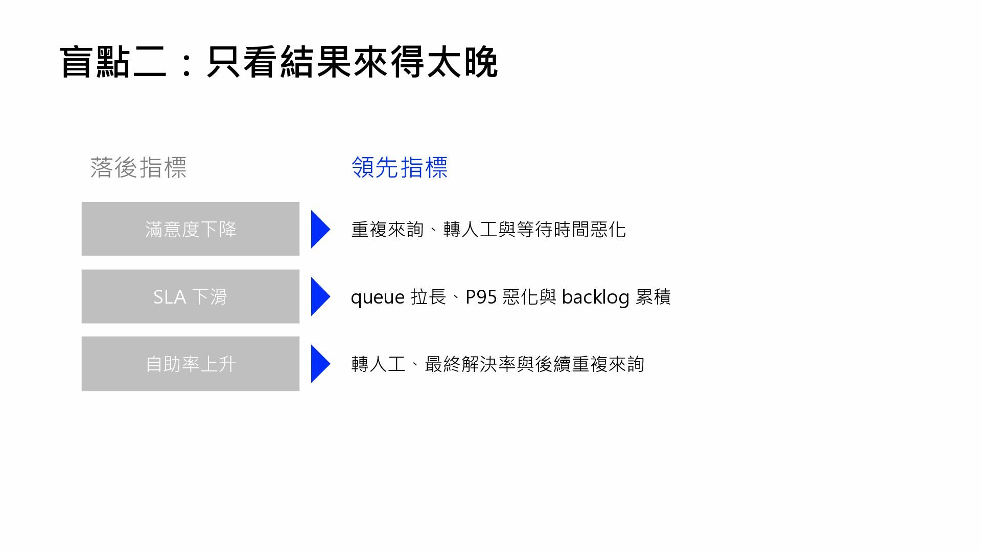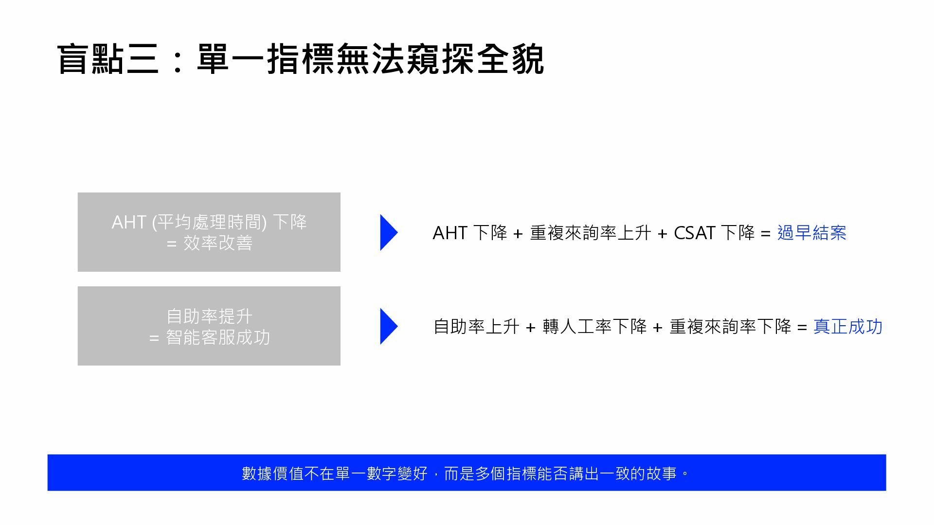 data • 對話內容 / 通話轉寫 • 客戶屬性與旅程資料 • 產品/交易/操作事件 • 滿意度與回饋資料 濾水系統 / 資料治理 (Data Governance) • 首次解決 • 有效轉人工 • AI 成功處理 • 客訴升級 • 最終解決率 • 重複來詢率 水管 / 資料流程 (Data Pipeline) • 能定期更新 • 能支援不同角色使用 • 能把分析結果回灌到營運流程 水龍頭 / 前端應用 (Applications) • 報表 • 預警系統 • Agent Assist • AI 分析