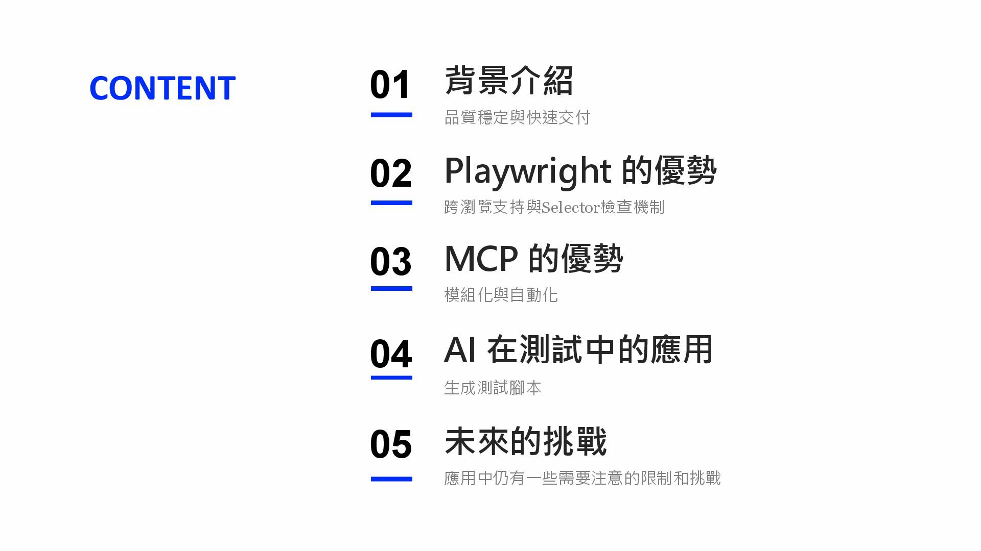 01 02 03 04 品質穩定與快速交付 跨瀏覽支持與Selector檢查機制 模組化與自動化 Playwright 的優勢 MCP