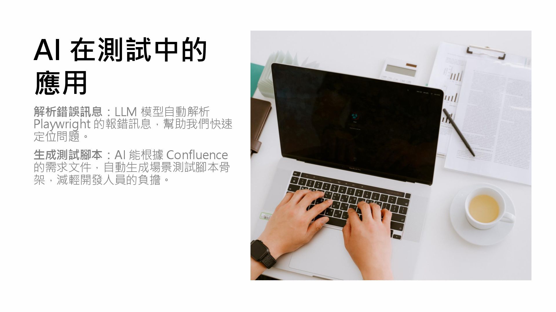 AI 在測試中的 應用 解析錯誤訊息:LLM 模型自動解析 Playwright 的報錯訊息,幫助我們快速 定位問題。 生成測試腳本:AI 能根據