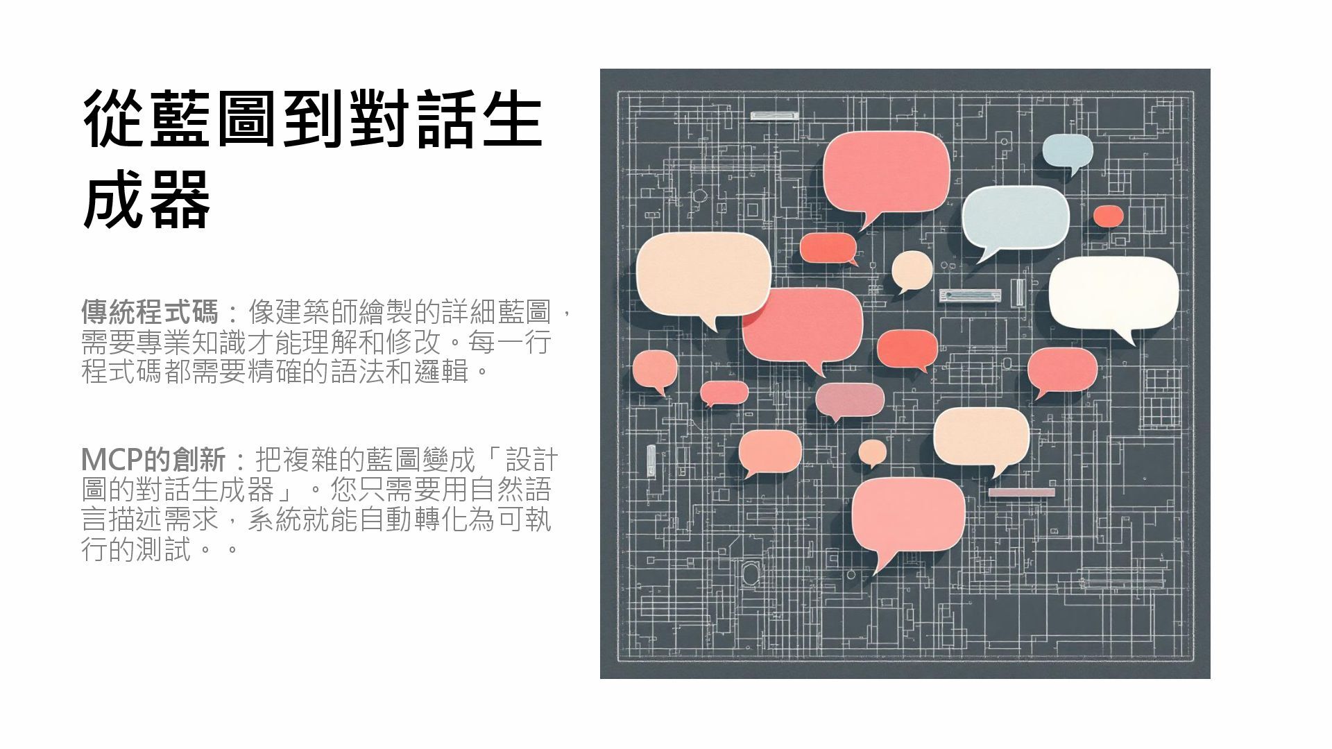 從藍圖到對話生 成器 傳統程式碼:像建築師繪製的詳細藍圖, 需要專業知識才能理解和修改。每一行 程式碼都需要精確的語法和邏輯。 MCP的創新:把複雜的藍圖變成「設計 圖的對話生成器」。您只需要用自然語 言描述需求,系統就能自動轉化為可執 行的測試。。