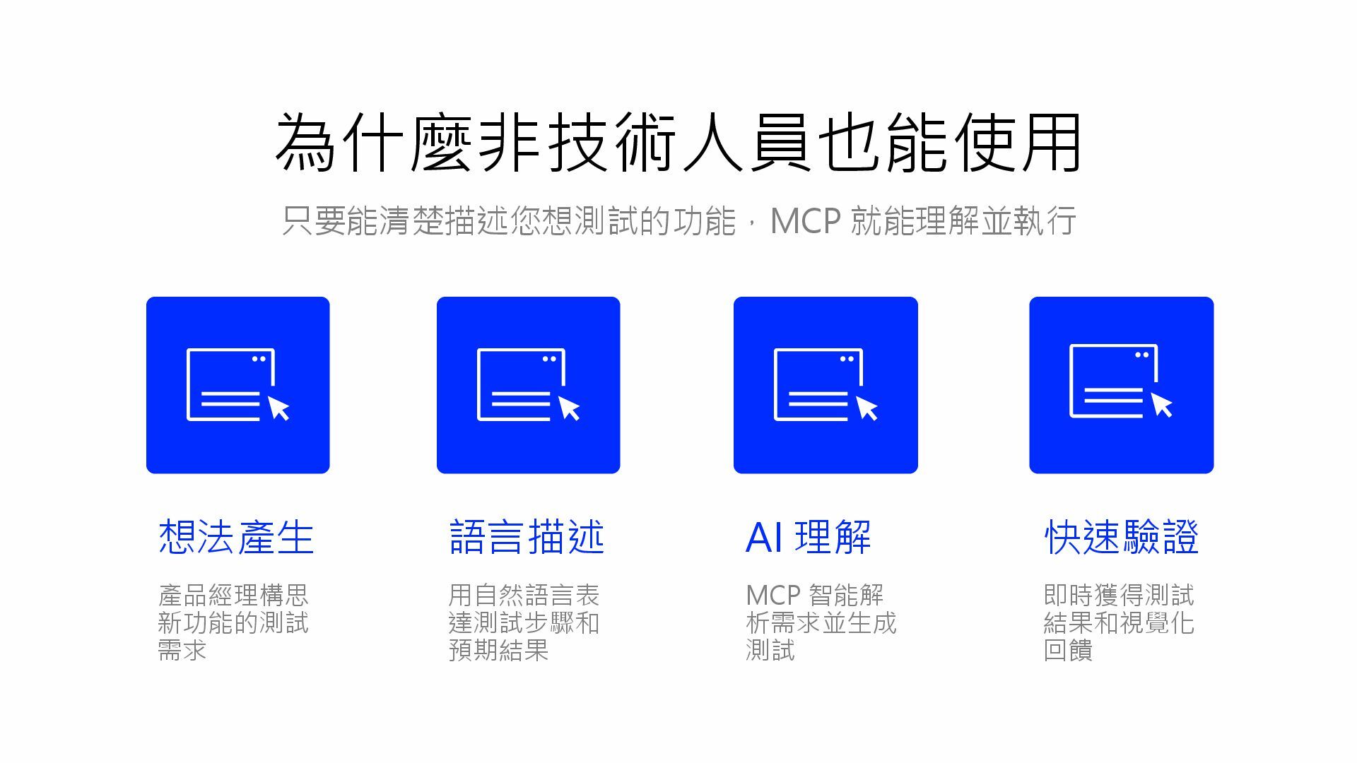 只要能清楚描述您想測試的功能,MCP 就能理解並執行 想法產生 產品經理構思 新功能的測試 需求 語言描述 AI 理解 MCP