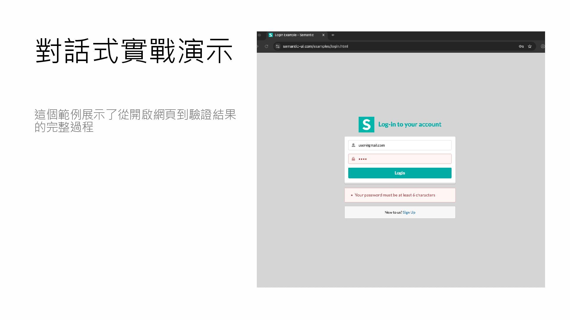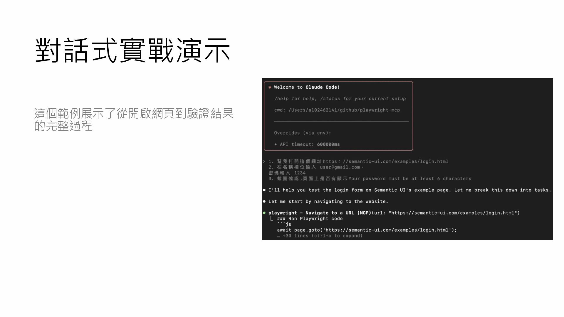 對話式實戰演示 這個範例展示了從開啟網頁到驗證結果 的完整過程