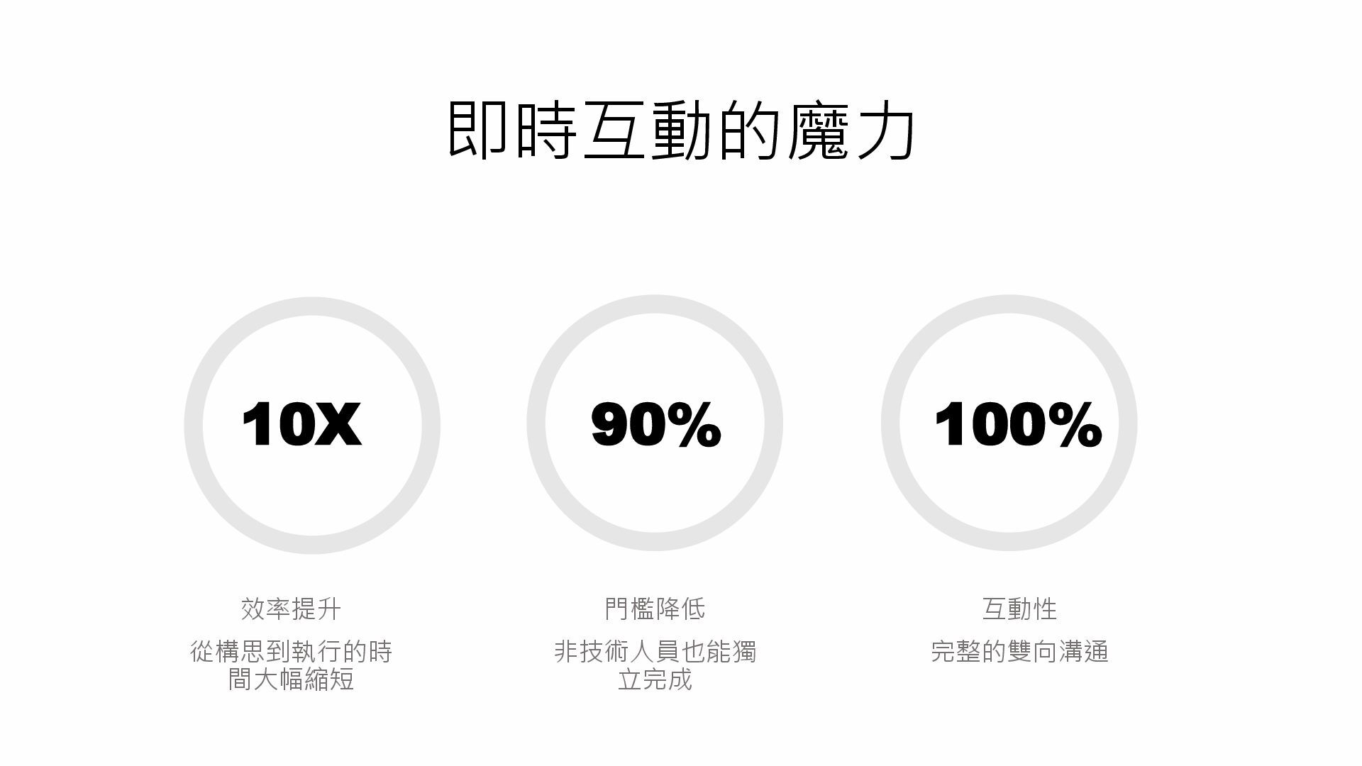 即時互動的魔力 10X 90% 100% 效率提升 從構思到執行的時 間大幅縮短 門檻降低 非技術人員也能獨 立完成