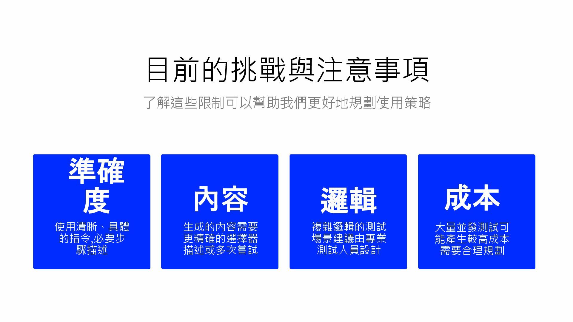 準確 度 使用清晰、具體 的指令,必要步 驟描述 目前的挑戰與注意事項 內容 生成的內容需要 更精確的選擇器 描述或多次嘗試