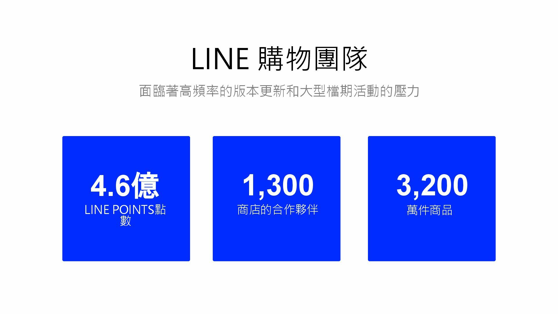 面臨著高頻率的版本更新和大型檔期活動的壓力 4.6億 LINE POINTS點 數 LINE 購物團隊 1,300 商店的合作夥伴 999