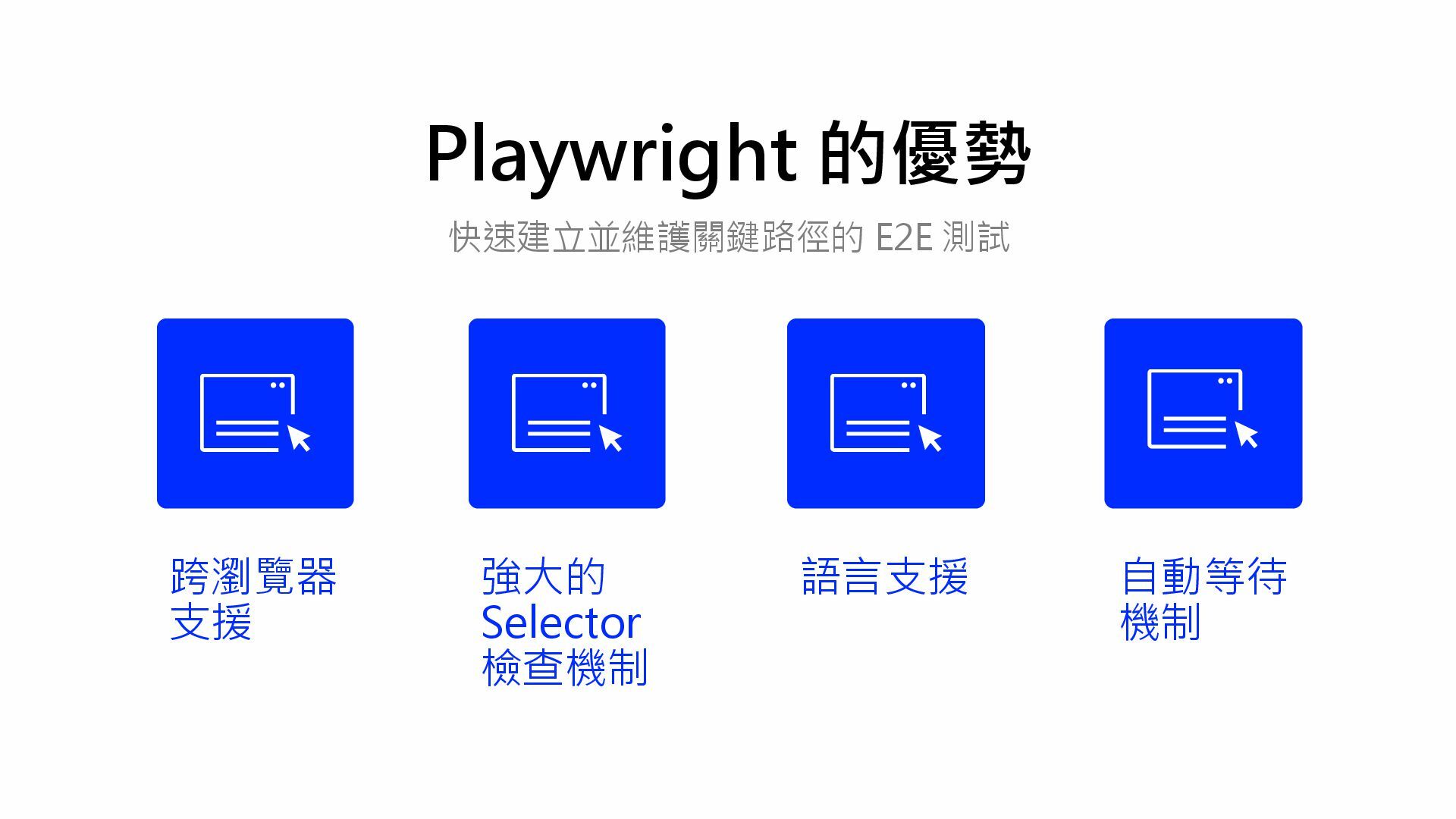 快速建立並維護關鍵路徑的 E2E 測試 跨瀏覽器 支援 強大的 Selector 檢查機制 語言支援 自動等待