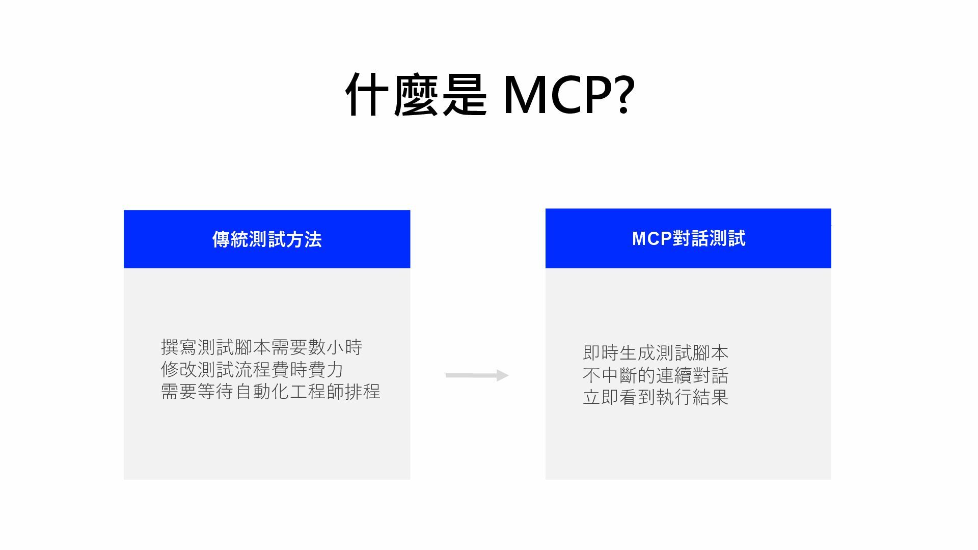 什麼是 MCP? 撰寫測試腳本需要數小時 修改測試流程費時費力 需要等待自動化工程師排程 即時生成測試腳本 不中斷的連續對話 立即看到執行結果 傳統測試方法 MCP對話測試