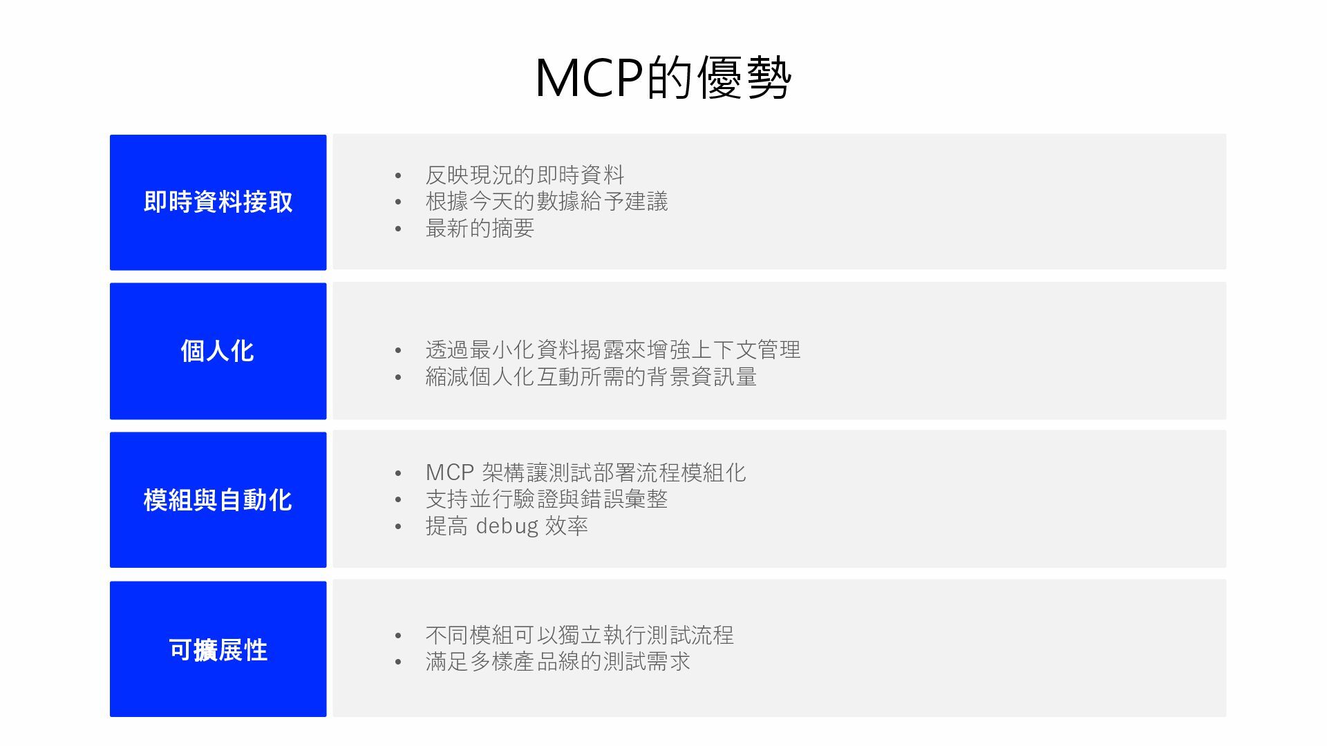 透過最小化資料揭露來增強上下文管理 • 縮減個人化互動所需的背景資訊量 模組與自動化 • MCP 架構讓測試部署流程模組化 • 支持並行驗證與錯誤彙整 • 提高 debug 效率 可擴展性 • 不同模組可以獨立執行測試流程 • 滿足多樣產品線的測試需求