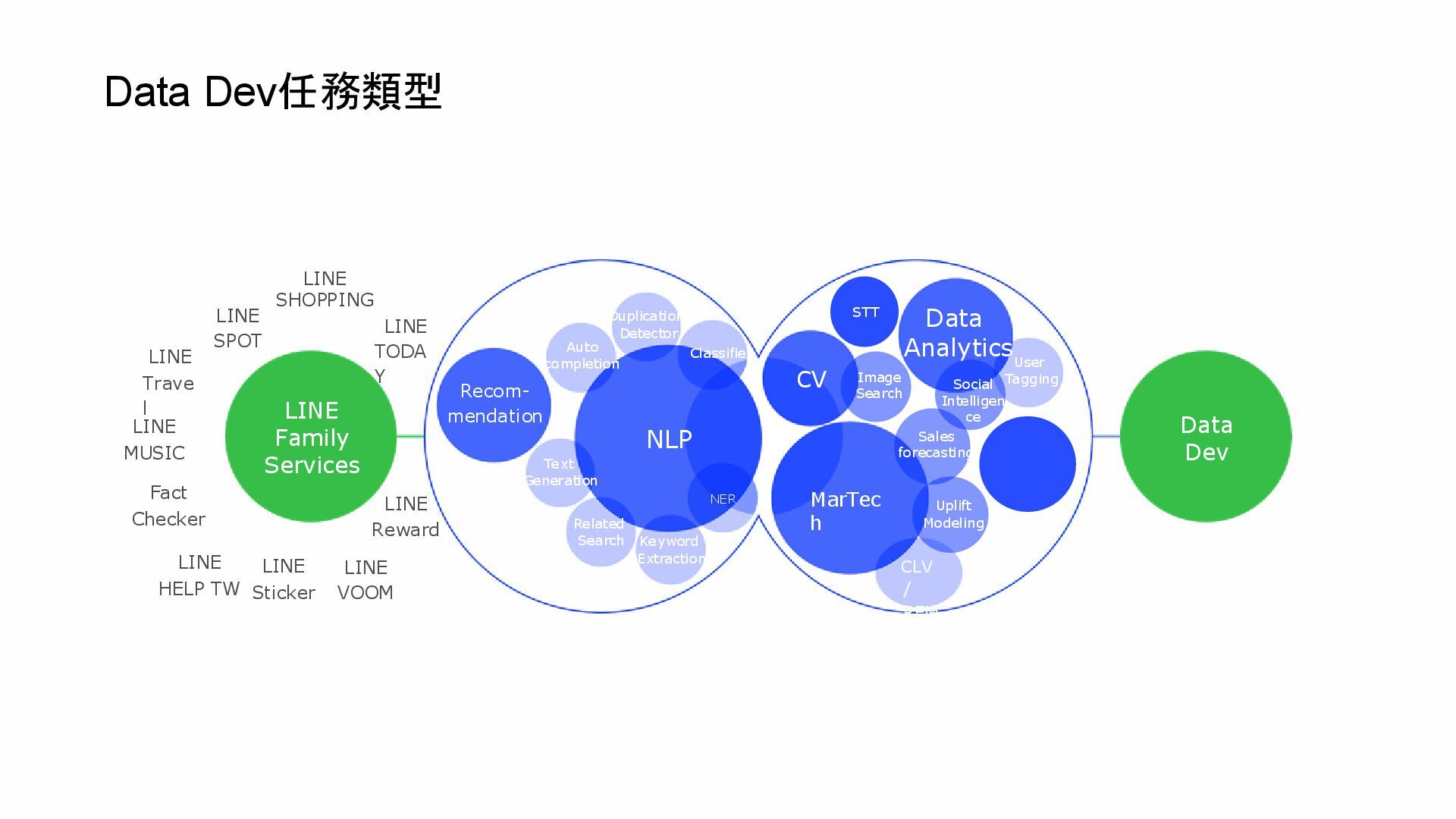 LINE MUSIC LINE Sticker LINE VOOM LINE Reward Fact Checker LINE HELP TW LINE Trave l NLP CV MarTec h NER Classifier Duplication Detector Auto completion Keyword Extraction Related Search Text Generation User Tagging Data Analytics Recom- mendation CLV / RFM SHOPPING LINE TODA Y Image Search Social Intelligen ce Uplift Modeling Sales forecasting STT