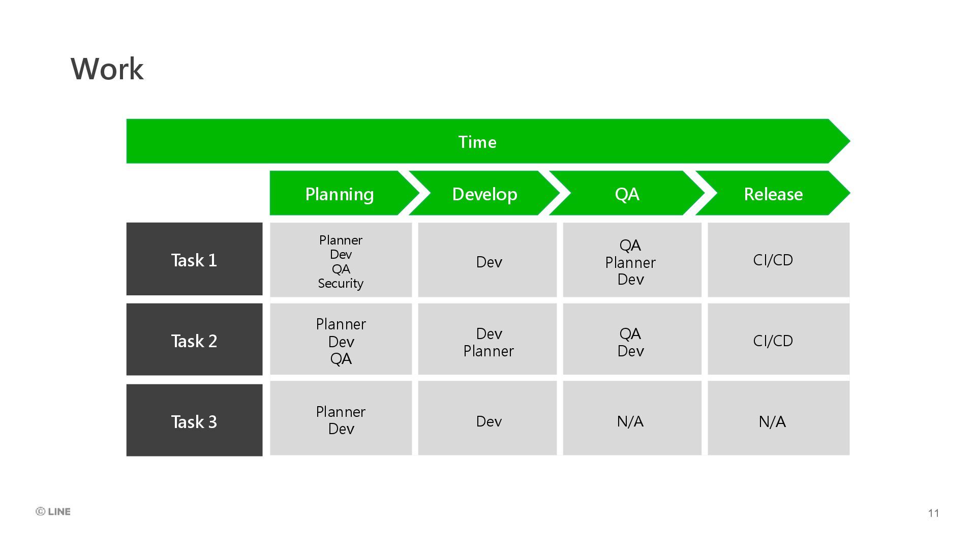 3 Planner Dev QA Security Dev QA Planner Dev Planner Dev QA Dev Planner QA Dev Planner Dev Dev N/A Time Work CI/CD CI/CD N/A