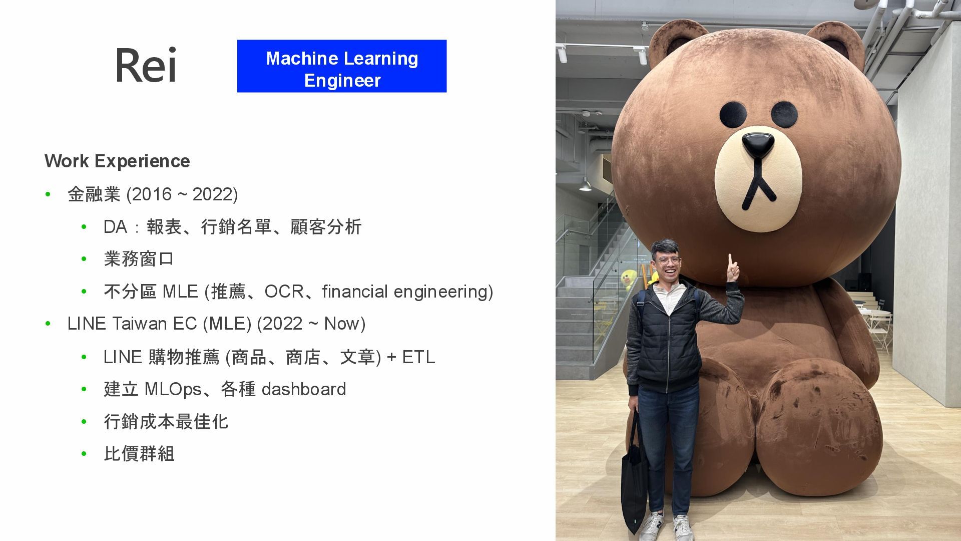 2022) • DA:報表、行銷名單、顧客分析 • 業務窗口 • 不分區 MLE (推薦、OCR、financial engineering) • LINE Taiwan EC (MLE) (2022 ~ Now) • LINE 購物推薦 (商品、商店、文章) + ETL • 建立 MLOps、各種 dashboard • 行銷成本最佳化 • 比價群組