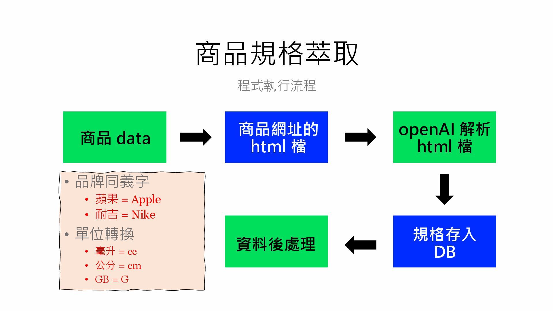 檔 規格存入 DB 資料後處理 • 品牌同義字 • 蘋果 = Apple • 耐吉 = Nike • 單位轉換 • 毫升 = cc • 公分 = cm • GB = G