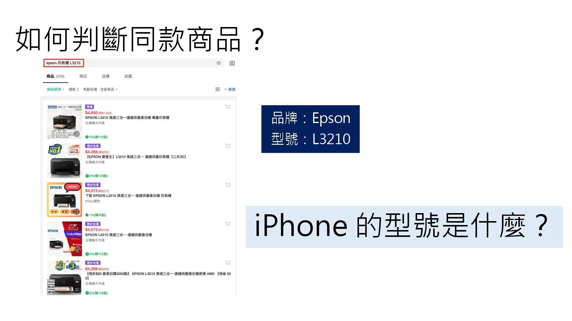 如何判斷同款商品? 品牌:Epson 型號:L3210 iPhone 的型號是什麼?