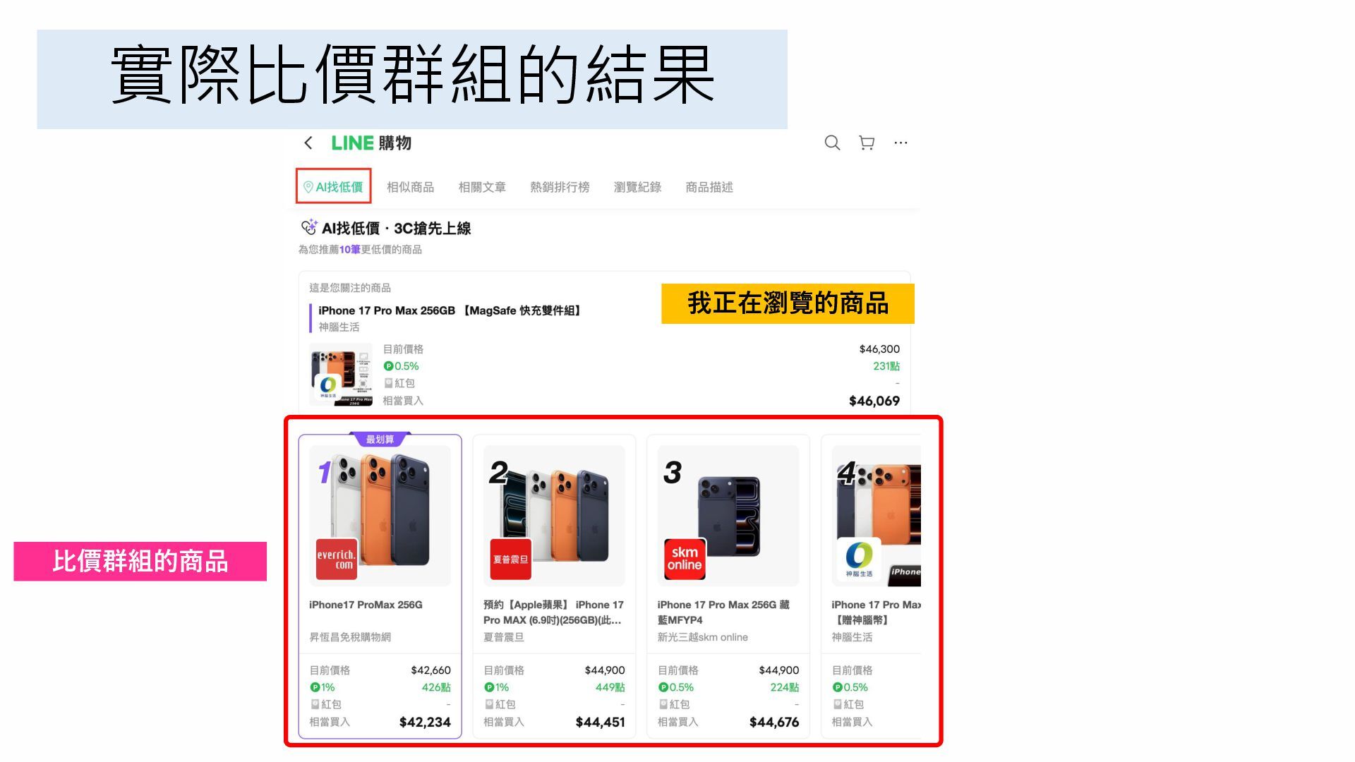 實際比價群組的結果 我正在瀏覽的商品 比價群組的商品