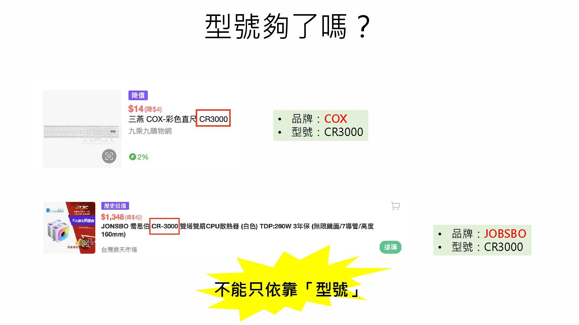 型號夠了嗎? • 品牌:COX • 型號:CR3000 • 品牌:JOBSBO • 型號:CR3000 不能只依靠「型號」