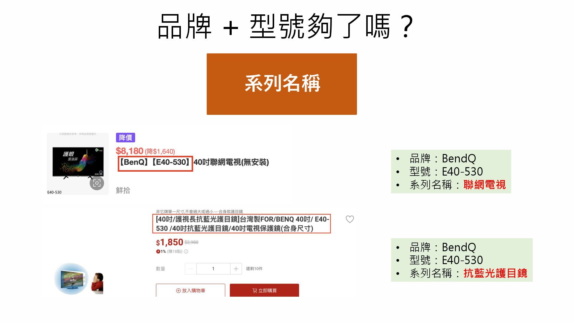 系列名稱 品牌 + 型號夠了嗎? • 品牌:BendQ • 型號:E40-530 • 系列名稱:聯網電視