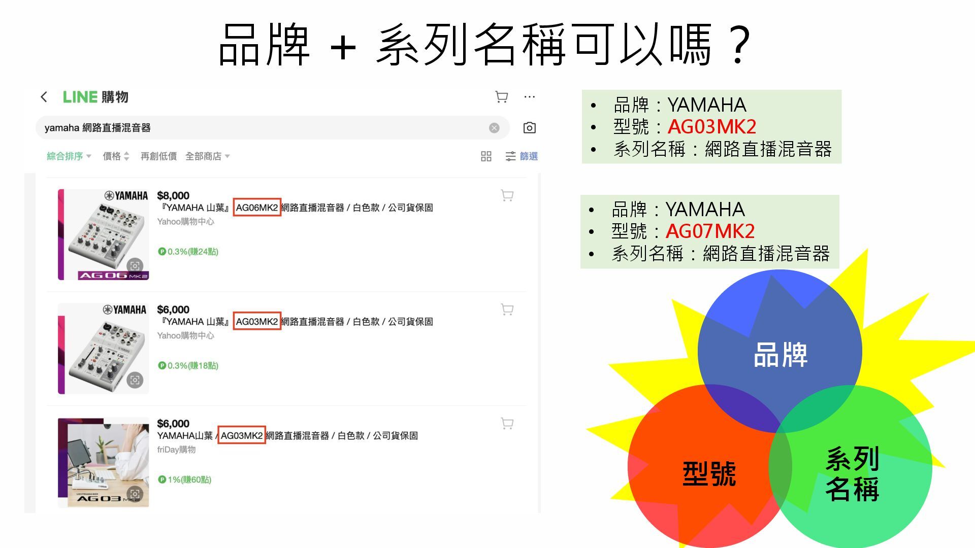 品牌 + 系列名稱可以嗎? • 品牌:YAMAHA • 型號:AG03MK2 • 系列名稱:網路直播混音器 •
